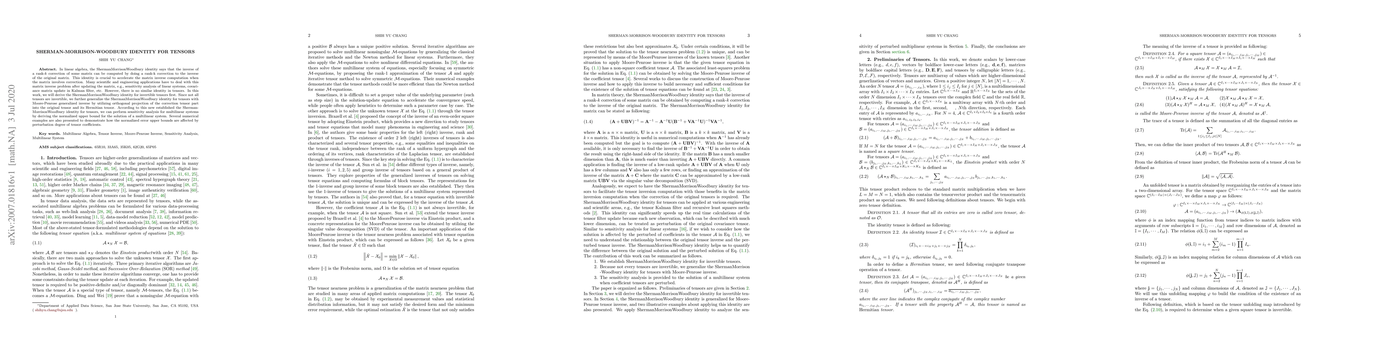 This paper derives the Sherman-Morrison-Woodbury identity for tensors, extending the matrix identity to tensors with Moore-Penrose generalized inverses. It provides a method to compute the inverse of tensors after rank-$k$ corrections, facilitating sensitivity analysis in multi-linear systems.