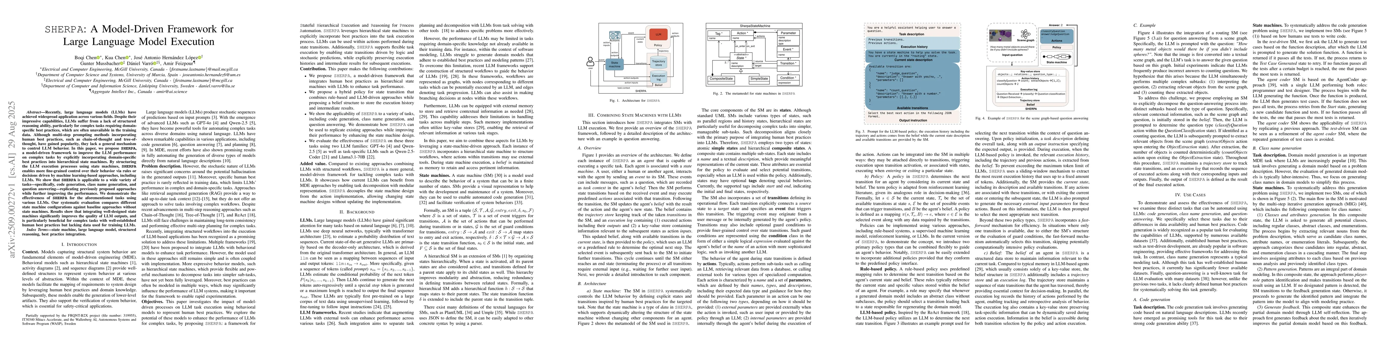 Recently, large language models (LLMs) have achieved widespread application across various fields. Despite their impressive capabilities, LLMs suffer from a lack of structured reasoning ability, particularly for complex tasks requiring domain-specific best practices, which are often unavailable in the training data. Although multi-step prompting methods incorporating human best practices, such as chain-of-thought and tree-of-thought, have gained popularity, they lack a general mechanism to control LLM behavior. In this paper, we propose SHERPA, a model-driven framework to improve the LLM performance on complex tasks by explicitly incorporating domain-specific best practices into hierarchical state machines. By structuring the LLM execution processes using state machines, SHERPA enables more fine-grained control over their behavior via rules or decisions driven by machine learning-based approaches, including LLMs. We show that SHERPA is applicable to a wide variety of tasks-specifically, code generation, class name generation, and question answering-replicating previously proposed approaches while further improving the performance. We demonstrate the effectiveness of SHERPA for the aforementioned tasks using various LLMs. Our systematic evaluation compares different state machine configurations against baseline approaches without state machines. Results show that integrating well-designed state machines significantly improves the quality of LLM outputs, and is particularly beneficial for complex tasks with well-established human best practices but lacking data used for training LLMs.
