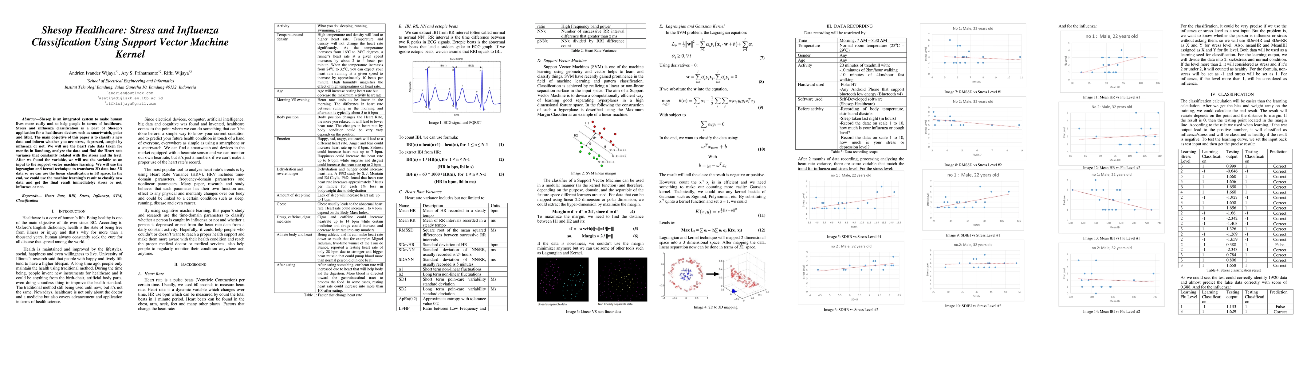 Shesop is an integrated system to make human lives more easily and to help people in terms of healthcare. Stress and influenza classification is a part of Shesop's application for a healthcare devices such as smartwatch, polar and fitbit. The main objective of this paper is to classify a new data and inform whether you are stress, depressed, caught by influenza or not. We will use the heart rate data taken for months in Bandung, analyze the data and find the Heart rate variance that constantly related with the stress and flu level. After we found the variable, we will use the variable as an input to the support vector machine learning. We will use the lagrangian and kernel technique to transform 2D data into 3D data so we can use the linear classification in 3D space. In the end, we could use the machine learning's result to classify new data and get the final result immediately: stress or not, influenza or not.