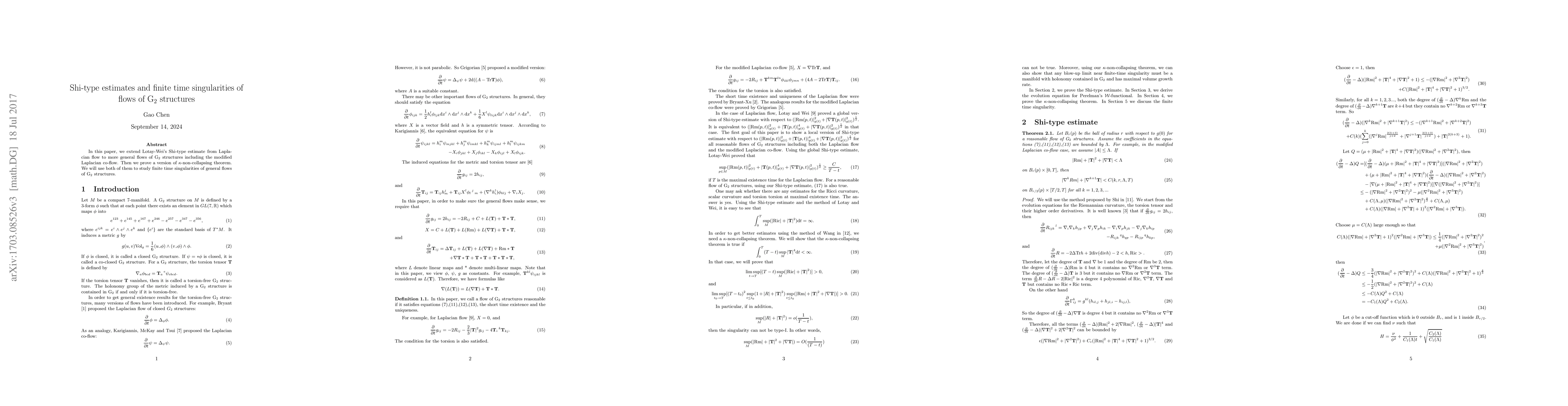 In this paper, we extend Lotay-Wei's Shi-type estimate from Laplacian flow to more general flows of G$_2$ structures including the modified Laplacian co-flow. Then we prove a version of $\kappa$-non-collapsing theorem. We will use both of them to study finite time singularities of general flows of G$_2$ structures.