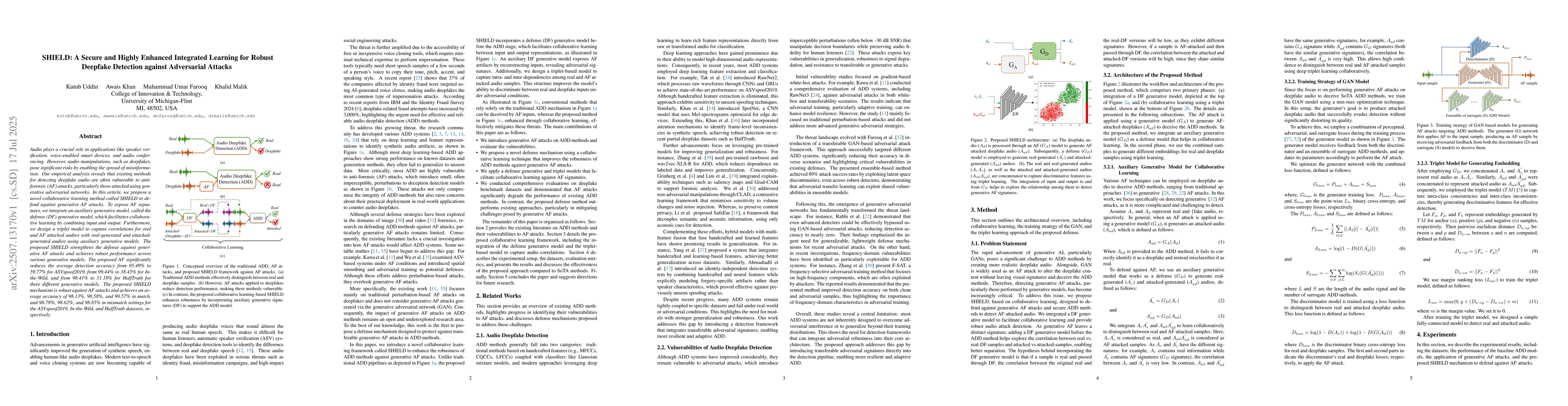 Audio plays a crucial role in applications like speaker verification, voice-enabled smart devices, and audio conferencing. However, audio manipulations, such as deepfakes, pose significant risks by enabling the spread of misinformation. Our empirical analysis reveals that existing methods for detecting deepfake audio are often vulnerable to anti-forensic (AF) attacks, particularly those attacked using generative adversarial networks. In this article, we propose a novel collaborative learning method called SHIELD to defend against generative AF attacks. To expose AF signatures, we integrate an auxiliary generative model, called the defense (DF) generative model, which facilitates collaborative learning by combining input and output. Furthermore, we design a triplet model to capture correlations for real and AF attacked audios with real-generated and attacked-generated audios using auxiliary generative models. The proposed SHIELD strengthens the defense against generative AF attacks and achieves robust performance across various generative models. The proposed AF significantly reduces the average detection accuracy from 95.49% to 59.77% for ASVspoof2019, from 99.44% to 38.45% for In-the-Wild, and from 98.41% to 51.18% for HalfTruth for three different generative models. The proposed SHIELD mechanism is robust against AF attacks and achieves an average accuracy of 98.13%, 98.58%, and 99.57% in match, and 98.78%, 98.62%, and 98.85% in mismatch settings for the ASVspoof2019, In-the-Wild, and HalfTruth datasets, respectively.