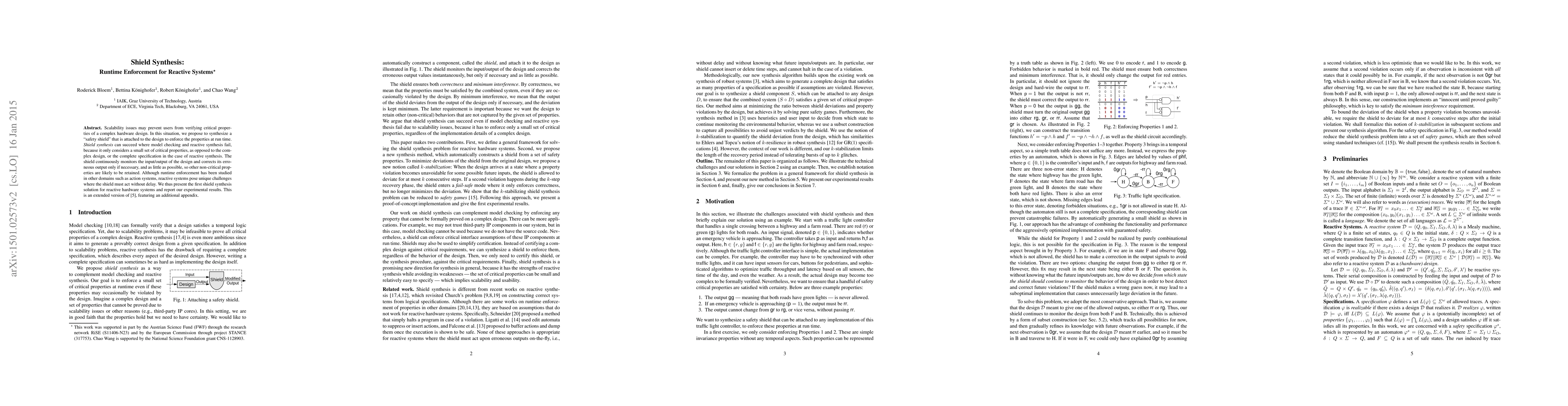This paper proposes a "safety shield" to enforce critical properties in complex hardware designs at runtime, addressing scalability issues in verification. Unlike model checking and reactive synthesis, the shield focuses on a small set of critical properties, monitoring and minimally correcting erroneous outputs to preserve non-critical properties.