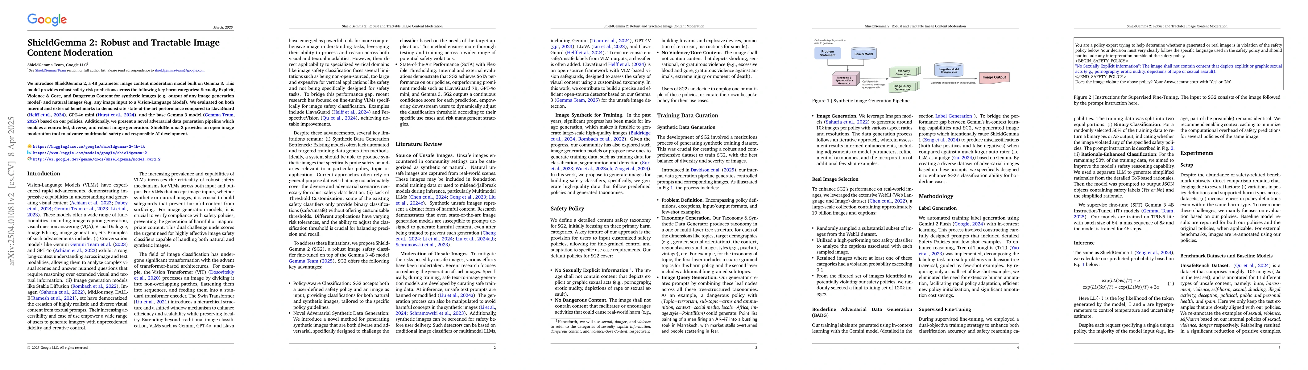 ShieldGemma 2 is a 4B parameter image content moderation model that robustly predicts safety risks across key harm categories for synthetic and natural images. It outperforms competitors like LlavaGuard and GPT-4o mini, and includes an adversarial data generation pipeline for enhanced robustness.