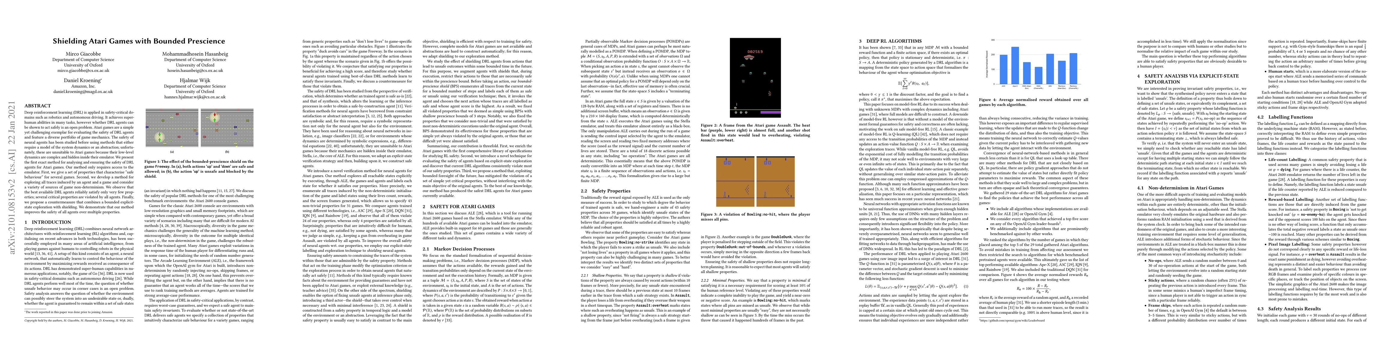 This paper introduces a novel method for ensuring the safety of deep reinforcement learning agents in Atari games, which lack suitable system dynamics models. The authors propose a technique that analyzes agent behavior through the game emulator, identifies critical safety properties, and employs a countermeasure combining exploration and shielding to enhance agent safety.
