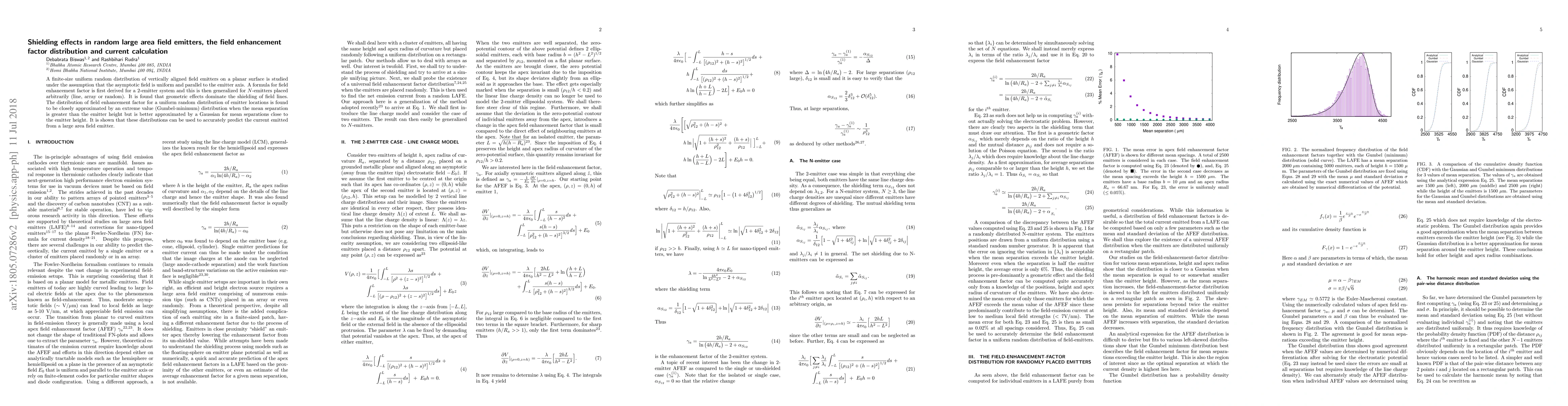 A finite-size uniform random distribution of vertically aligned field emitters on a planar surface is studied under the assumption that the asymptotic field is uniform and parallel to the emitter axis. A formula for field enhancement factor is first derived for a 2-emitter system and this is then generalized for $N$-emitters placed arbitrarily (line, array or random). It is found that geometric effects dominate the shielding of field lines. The distribution of field enhancement factor for a uniform random distribution of emitter locations is found to be closely approximated by an extreme value (Gumbel-minimum) distribution when the mean separation is greater than the emitter height but is better approximated by a Gaussian for mean separations close to the emitter height. It is shown that these distributions can be used to accurately predict the current emitted from a large area field emitter.