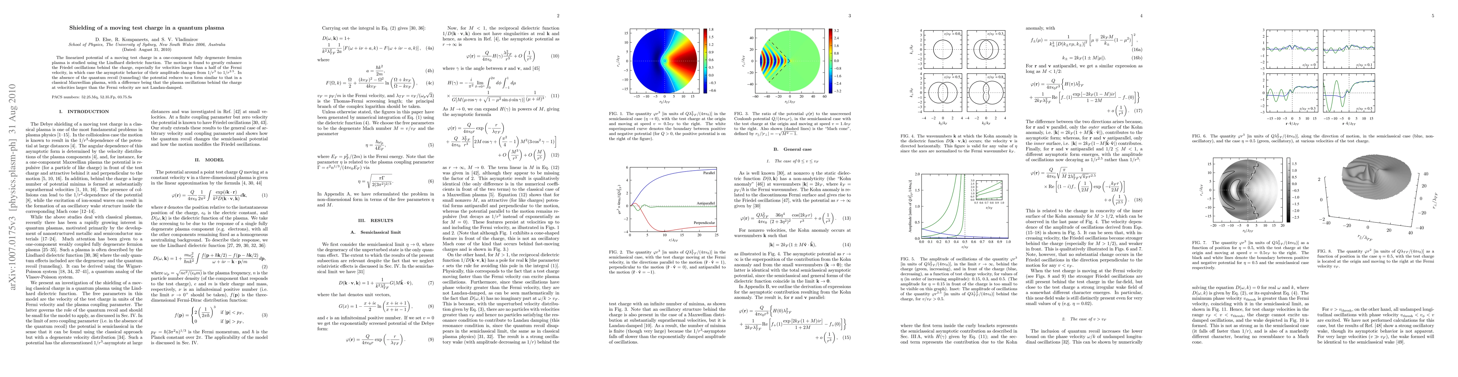 The research examines a moving test charge's shielding in a quantum plasma using the Lindhard dielectric function. Key findings include enhanced Friedel oscillations behind the charge at velocities greater than half the Fermi velocity, with amplitude asymptotic behavior shifting from 1/r^3 to 1/r^2.5. Without quantum recoil, the potential resembles a classical Maxwellian plasma, but with non-Landau-damped plasma oscillations at velocities exceeding the Fermi velocity.
