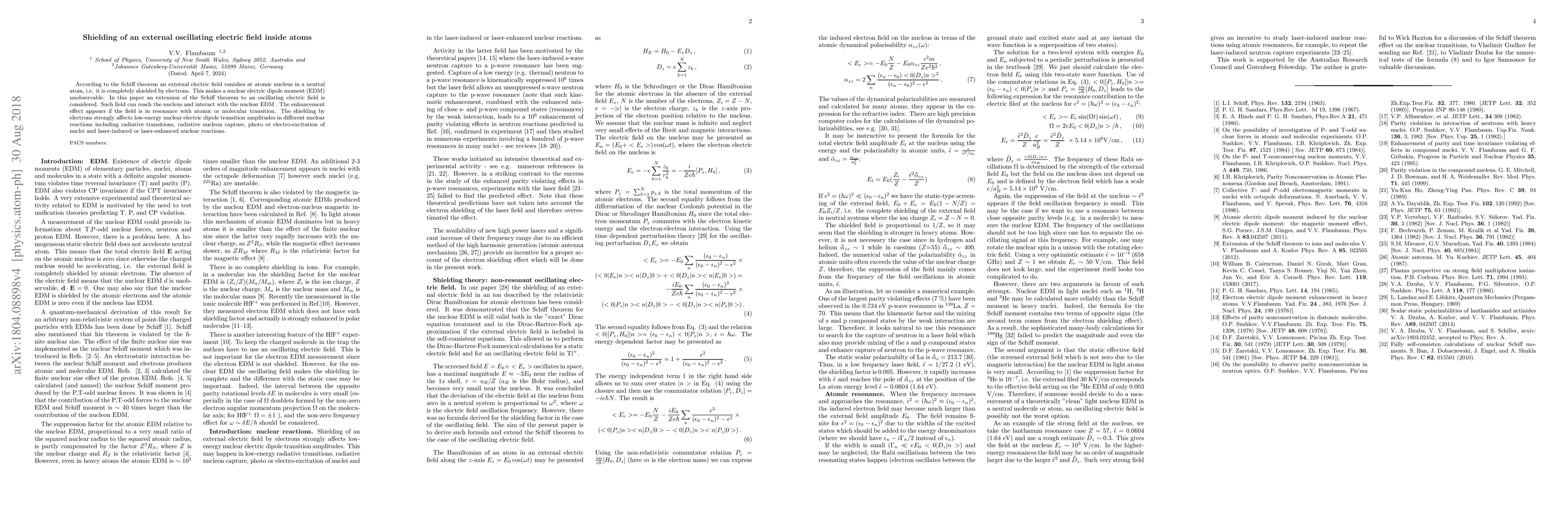 This paper extends the Schiff theorem to oscillating electric fields, showing that while electrons shield an external static field at the nucleus, an oscillating field can reach the nucleus and interact with the nuclear electric dipole moment, especially if it resonates with atomic or molecular transitions. The shielding effect influences low-energy nuclear electric dipole transitions in various nuclear reactions.