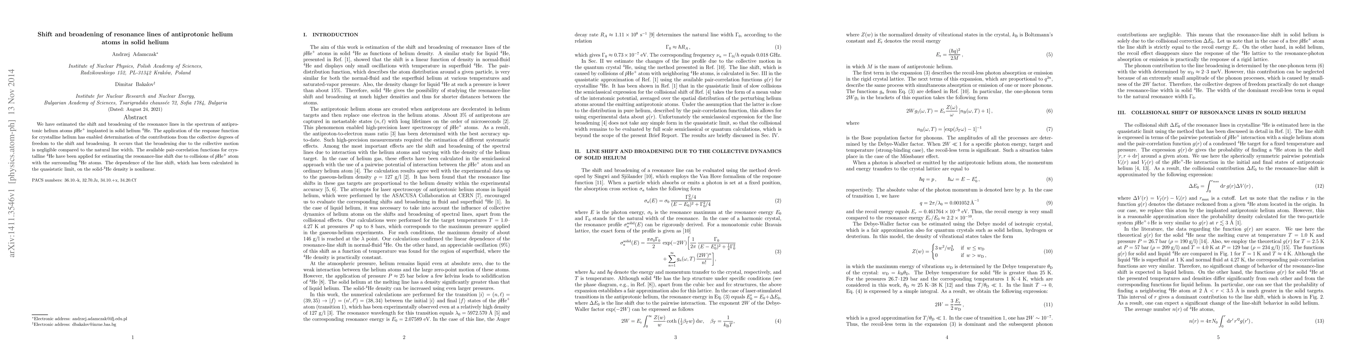 We have estimated the shift and broadening of the resonance lines in the spectrum of antiprotonic helium atoms $\bar{p}\mathrm{He}^{+}$ implanted in solid helium $^4$He. The application of the response function for crystalline helium has enabled determination of the contributions from the collective degrees of freedom to the shift and broadening. It occurs that the broadening due to the collective motion is negligible compared to the natural line width. The available pair-correlation functions for crystalline $^4$He have been applied for estimating the resonance-line shift due to collisions of $\bar{p}\mathrm{He}^{+}$ atom with the surrounding $^4$He atoms. The dependence of the line shift, which has been calculated in the quasistatic limit, on the solid-$^4$He density is nonlinear.