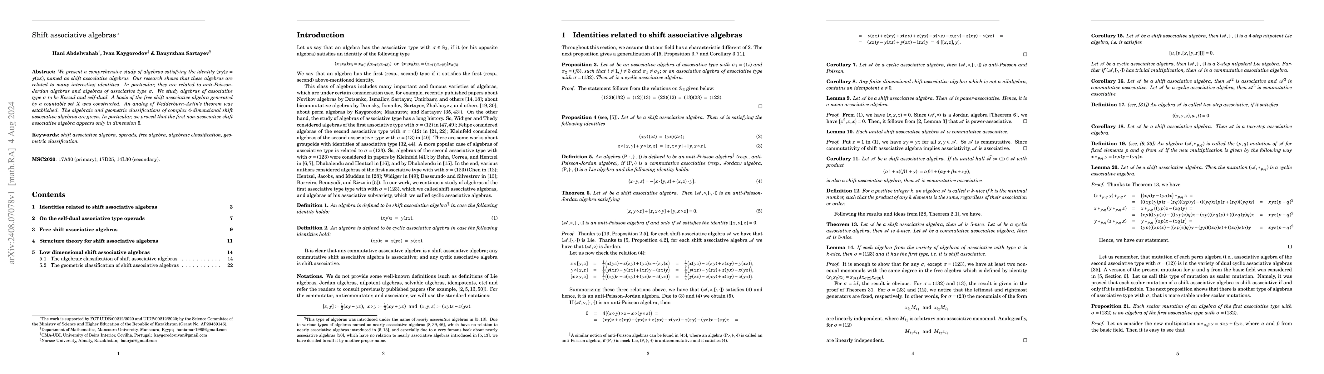 We present a comprehensive study of algebras satisfying the identity $(xy)z=y(zx),$ named as shift associative algebras. Our research shows that these algebras are related to many interesting identities. In particular, they are related to anti-Poisson-Jordan algebras and algebras of associative type $\sigma$. We study algebras of associative type $\sigma$ to be Koszul and self-dual. A basis of the free shift associative algebra generated by a countable set $X$ was constructed. An analog of Wedderburn-Artin's theorem was established. The algebraic and geometric classifications of complex $4$-dimensional shift associative algebras are given. In particular, we proved that the first non-associative shift associative algebra appears only in dimension $5$.