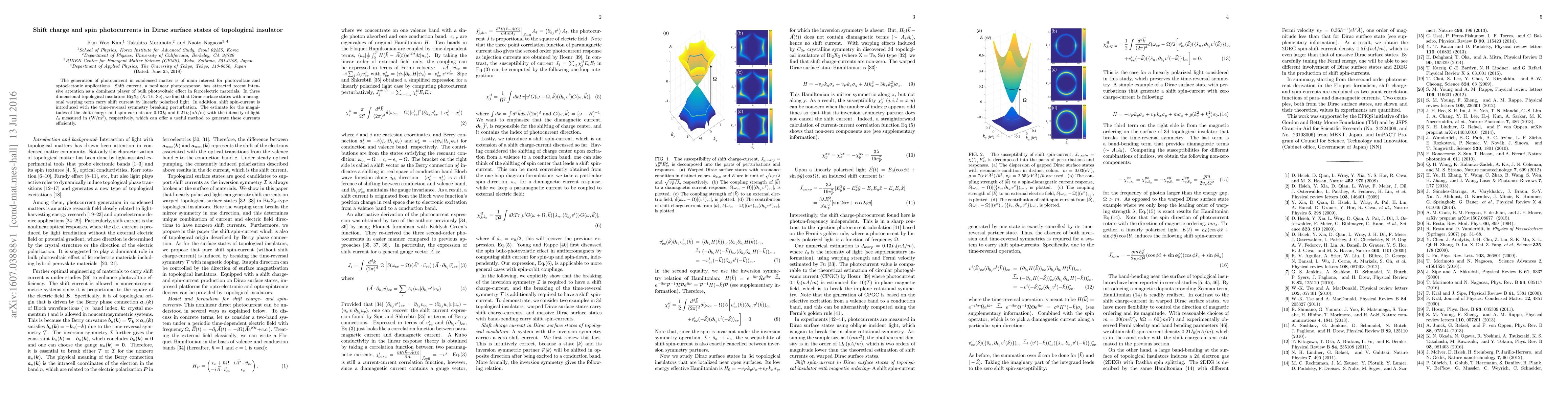 The generation of photocurrent in condensed matter is of main interest for photovoltaic and optoelectronic applications. Shift current, a nonlinear photoresponse, has attracted recent intensive attention as a dominant player of bulk photovoltaic effect in ferroelectric materials. In three dimensional topological insulators $\text{Bi}_2\text{X}_3$ (X: Te, Se), we find that Dirac surface states with a hexagonal warping term carry shift current by linearly polarized light. In addition, shift spin-current is introduced with the time-reversal symmetry breaking perturbation. The estimate for the magnitudes of the shift charge- and spin-currents are 0.13$I_0$ and 0.21$I_0$(nA/m) with the intensity of light $I_0$ measured in $(\text{W}/\text{m}^2)$, respectively, which can offer a useful method to generate these currents efficiently.