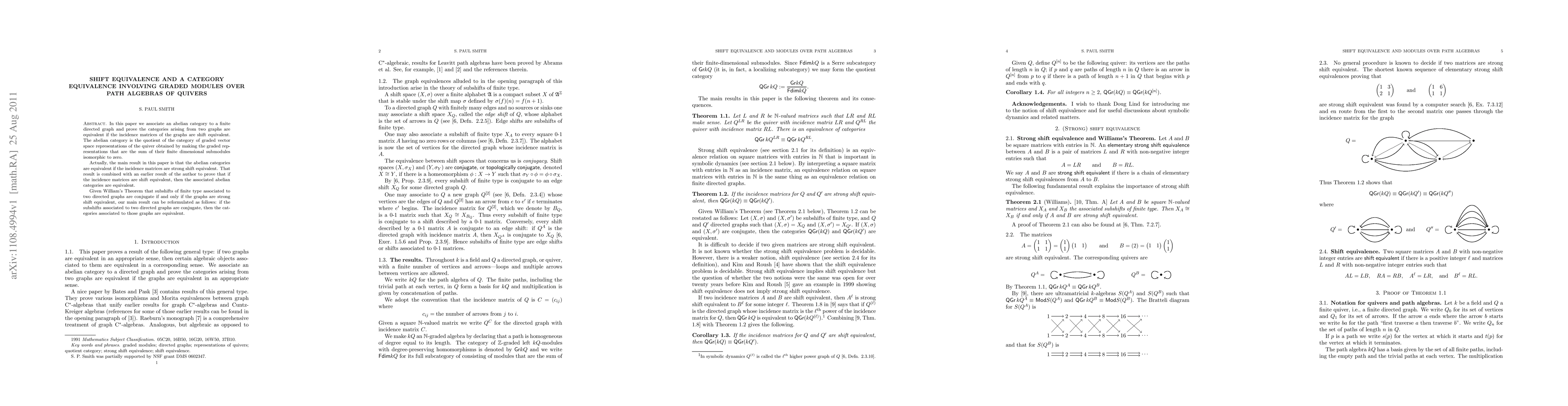In this paper we associate an abelian category to a finite directed graph and prove the categories arising from two graphs are equivalent if the incidence matrices of the graphs are shift equivalent. The abelian category is the quotient of the category of graded vector space representations of the quiver obtained by making the graded representations that are the sum of their finite dimensional submodules isomorphic to zero. Actually, the main result in this paper is that the abelian categories are equivalent if the incidence matrices are strong shift equivalent. That result is combined with an earlier result of the author to prove that if the incidence matrices are shift equivalent, then the associated abelian categories are equivalent. Given William's Theorem that subshifts of finite type associated to two directed graphs are conjugate if and only if the graphs are strong shift equivalent, our main result can be reformulated as follows: if the subshifts associated to two directed graphs are conjugate, then the categories associated to those graphs are equivalent.