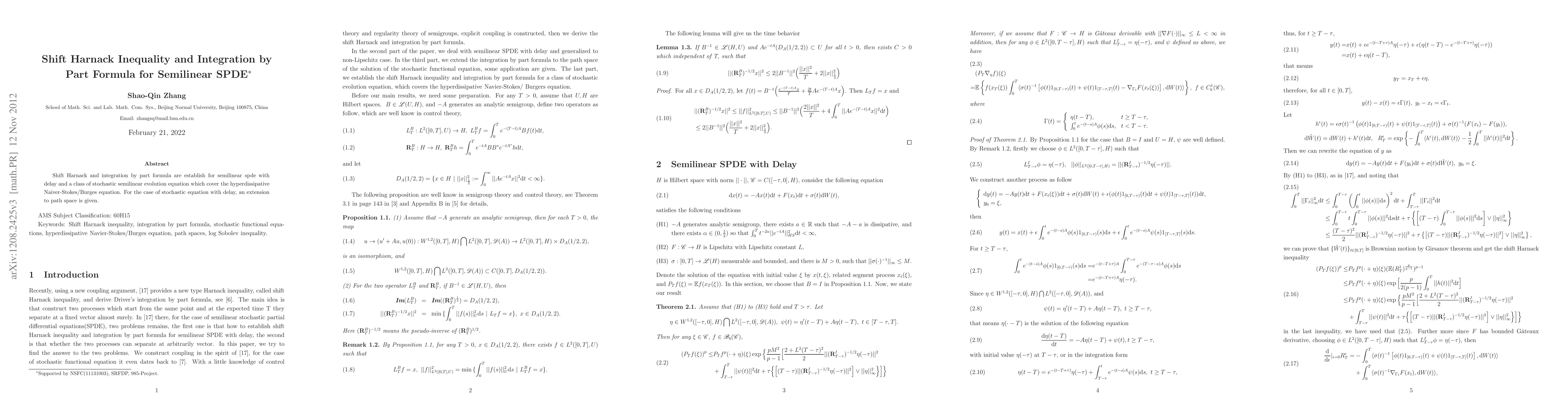 Shift Harnack and integration by part formula are establish for semilinear spde with delay and a class of stochastic semilinear evolution equation which cover the hyperdissipative Naiver-Stokes/Burges equation. For the case of stochastic equation with delay, an extension to path space is given.