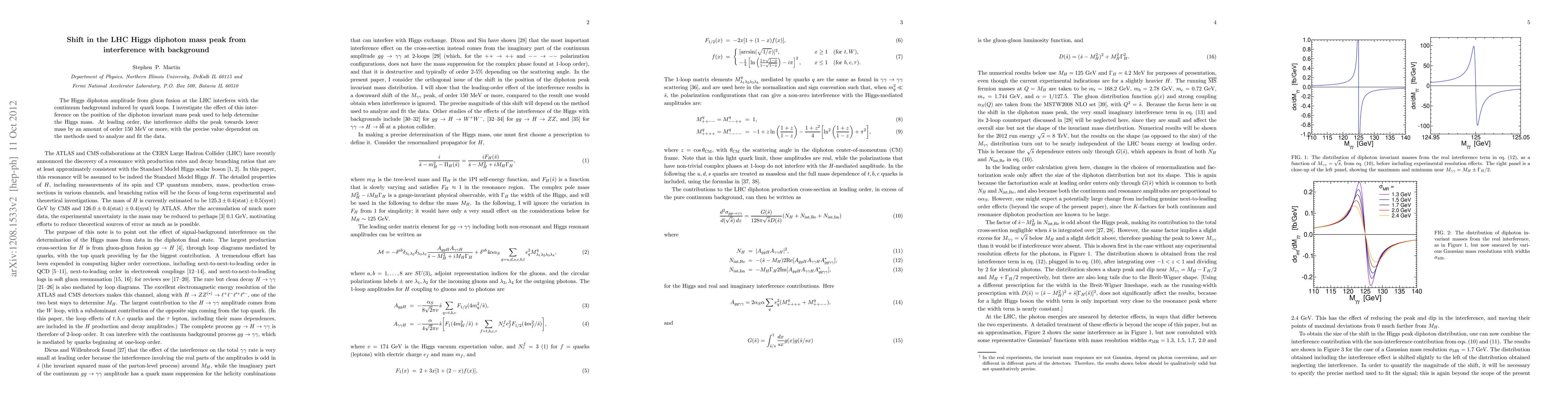 Summary: This research examines how interference between the Higgs diphoton amplitude and the continuum background from quark loops shifts the diphoton invariant mass peak at the LHC, potentially lowering the peak by around 150 MeV or more, depending on the data analysis methods.