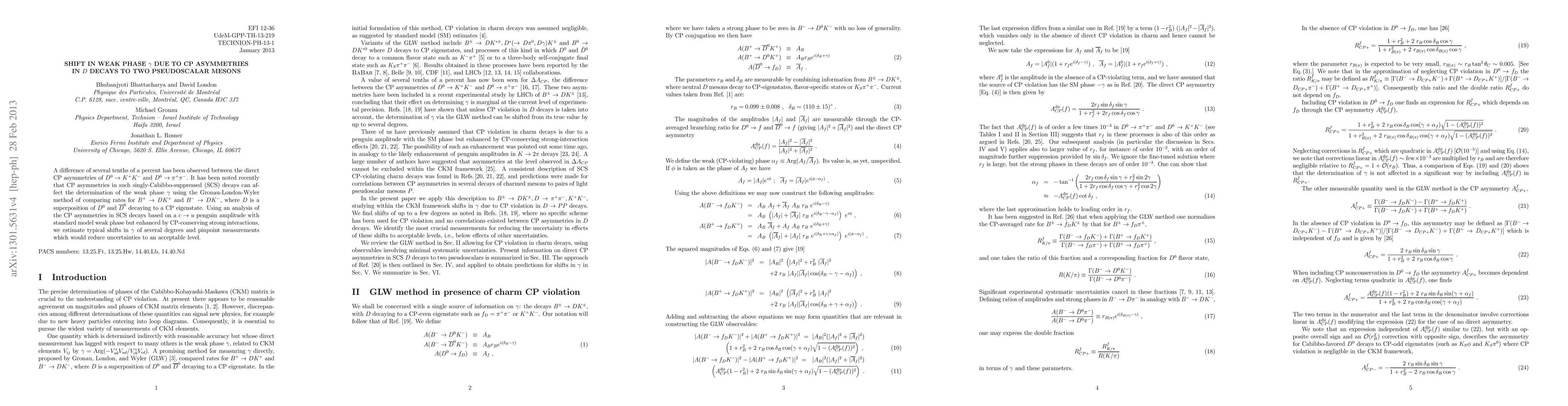 A difference of several tenths of a percent has been observed between the direct CP asymmetries of $D^0\to K^+K^-$ and $D^0\to \pi^+\pi^-$. It has been noted recently that CP asymmetries in such singly-Cabibbo-suppressed (SCS) decays can affect the determination of the weak phase $\gamma$ using the Gronau-London-Wyler method of comparing rates for $B^+ \to D K^+$ and $B^- \to D K^-$, where $D$ is a superposition of $D^0$ and $\od$ decaying to a CP eigenstate. Using an analysis of the CP asymmetries in SCS decays based on a $c \to u$ penguin amplitude with standard model weak phase but enhanced by CP-conserving strong interactions, we estimate typical shifts in $\gamma$ of several degrees and pinpoint measurements which would reduce uncertainties to an acceptable level.