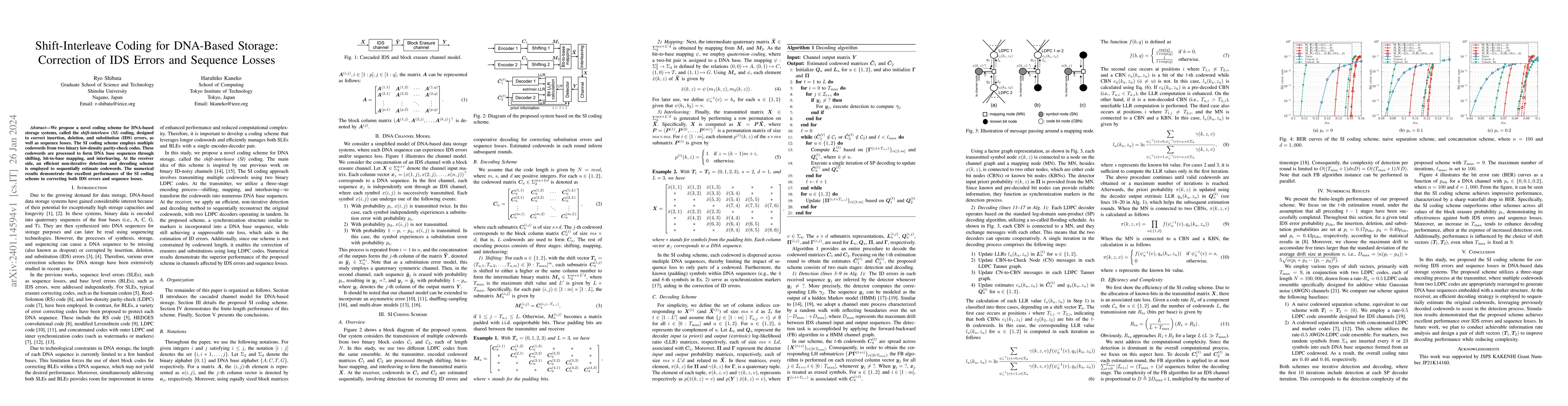 The paper introduces shift-interleave (SI) coding for DNA storage, combining binary low-density parity-check codes to correct IDS errors and sequence losses. An efficient non-iterative decoding method is used, showing excellent performance in error correction.