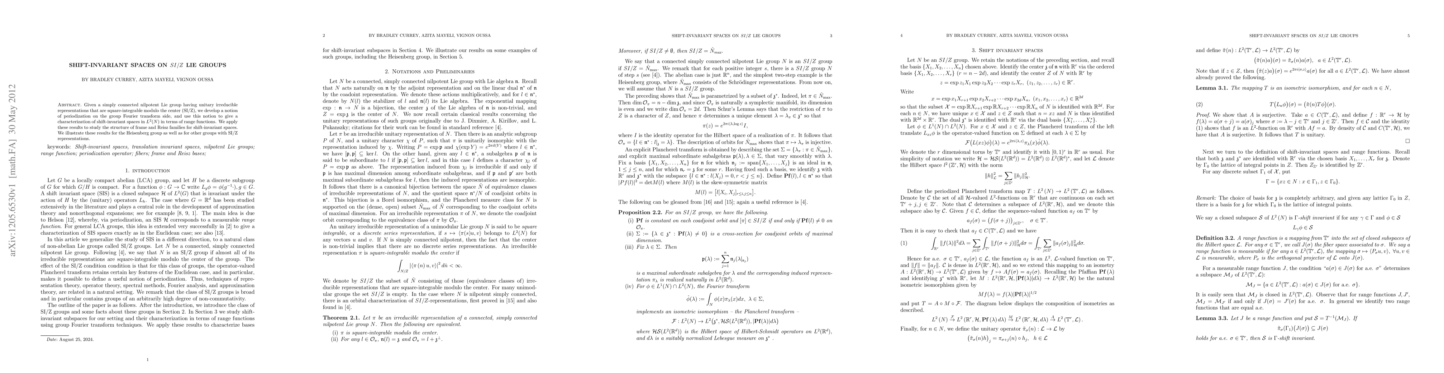 This paper develops a notion of periodization for the Fourier transform on simply connected nilpotent Lie groups with SI/Z representations, characterizing shift-invariant spaces in $L^2(N)$ via range functions and exploring their frame and Reisz families, exemplified through the Heisenberg group.