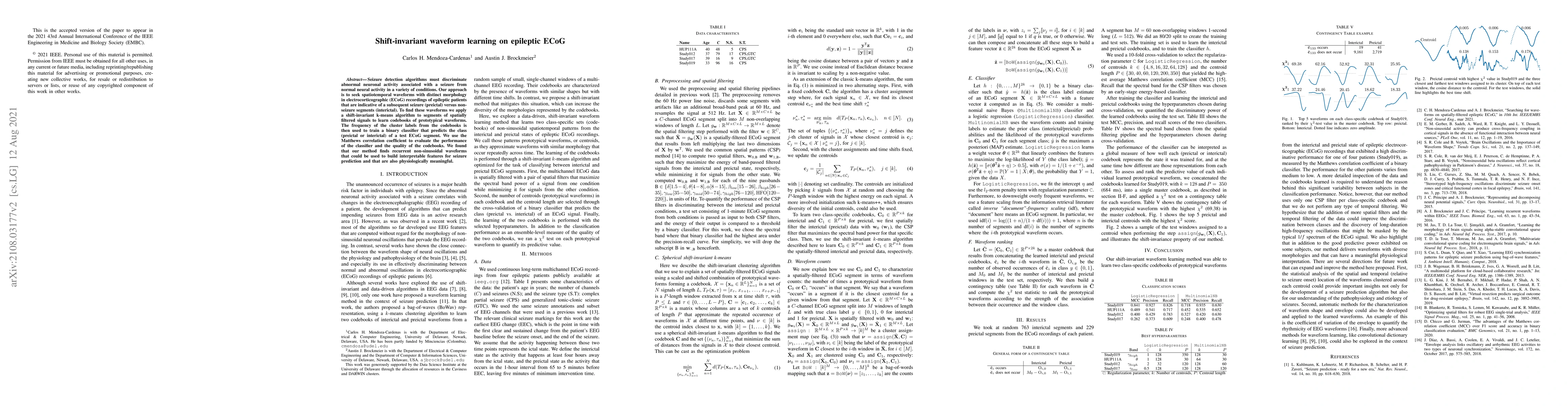 Seizure detection algorithms must discriminate abnormal neuronal activity associated with a seizure from normal neural activity in a variety of conditions. Our approach is to seek spatiotemporal waveforms with distinct morphology in electrocorticographic (ECoG) recordings of epileptic patients that are indicative of a subsequent seizure (preictal) versus non-seizure segments (interictal). To find these waveforms we apply a shift-invariant k-means algorithm to segments of spatially filtered signals to learn codebooks of prototypical waveforms. The frequency of the cluster labels from the codebooks is then used to train a binary classifier that predicts the class (preictal or interictal) of a test ECoG segment. We use the Matthews correlation coefficient to evaluate the performance of the classifier and the quality of the codebooks. We found that our method finds recurrent non-sinusoidal waveforms that could be used to build interpretable features for seizure prediction and that are also physiologically meaningful.