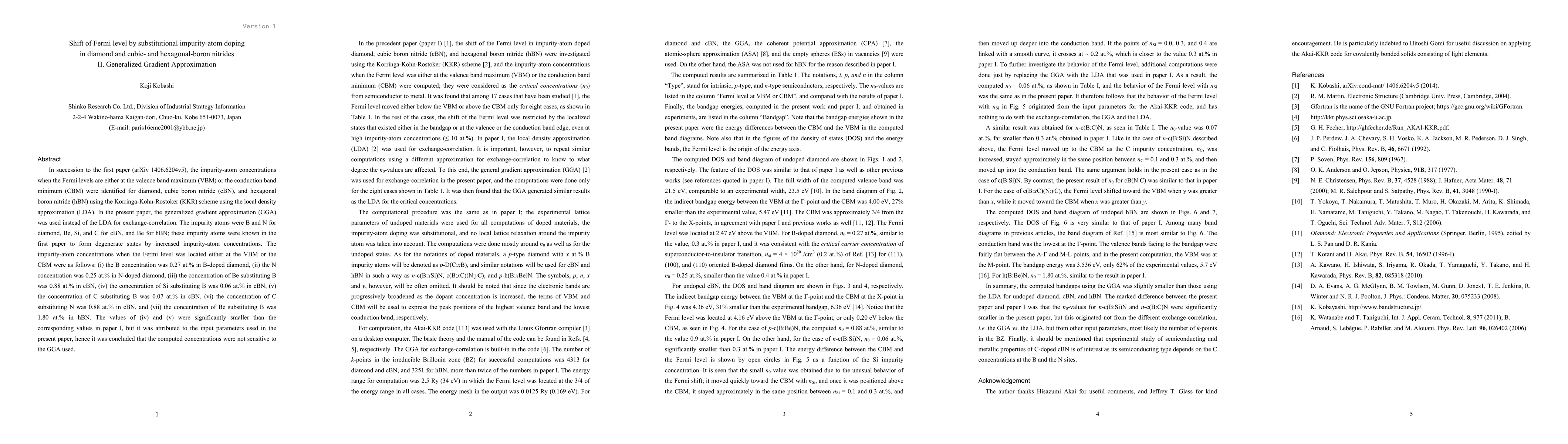 In succession to the first paper (arXiv 1406.6204v5), the impurity-atom concentrations when the Fermi levels are either at the valence band maximum (VBM) or the conduction band minimum (CBM) were identified for diamond, cubic boron nitride (cBN), and hexagonal boron nitride (hBN) using the Korringa-Kohn-Rostoker (KKR) scheme using the local density approximation (LDA). In the present paper, the generalized gradient approximation (GGA) was used instead of the LDA for exchange-correlation. The impurity atoms were B and N for diamond, Be, Si, and C for cBN, and Be for hBN; these impurity atoms were known in the first paper to form degenerate states by increased impurity-atom concentrations. The impurity-atom concentrations when the Fermi level was located either at the VBM or the CBM were as follows: (i) the B concentration was 0.27 at.% in B-doped diamond, (ii) the N concentration was 0.25 at.% in N-doped diamond, (iii) the concentration of Be substituting B was 0.88 at.% in cBN, (iv) the concentration of Si substituting B was 0.06 at.% in cBN, (v) the concentration of C substituting B was 0.07 at.% in cBN, (vi) the concentration of C substituting N was 0.88 at.% in cBN, and (vii) the concentration of Be substituting B was 1.80 at.% in hBN. The values of (iv) and (v) were significantly smaller than the corresponding values in paper I, but it was attributed to the input parameters used in the present paper, hence it was concluded that the computed concentrations were not sensitive to the GGA used.