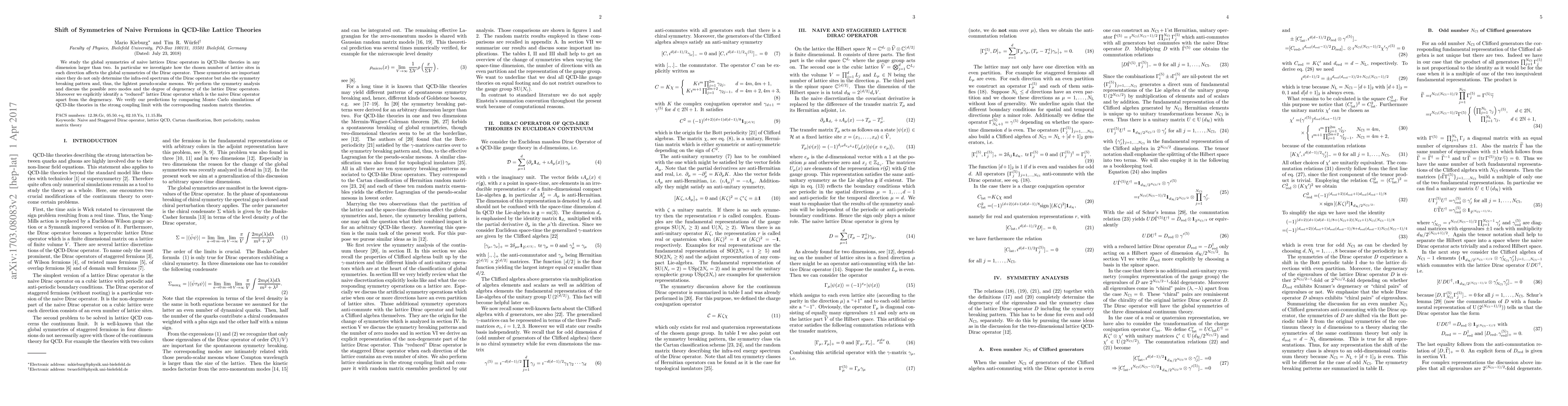 This paper investigates the global symmetries of naive lattice Dirac operators in QCD-like theories, analyzing how the number of lattice sites affects these symmetries. It identifies a "reduced" lattice Dirac operator and verifies predictions through Monte Carlo simulations compared to random matrix theories.