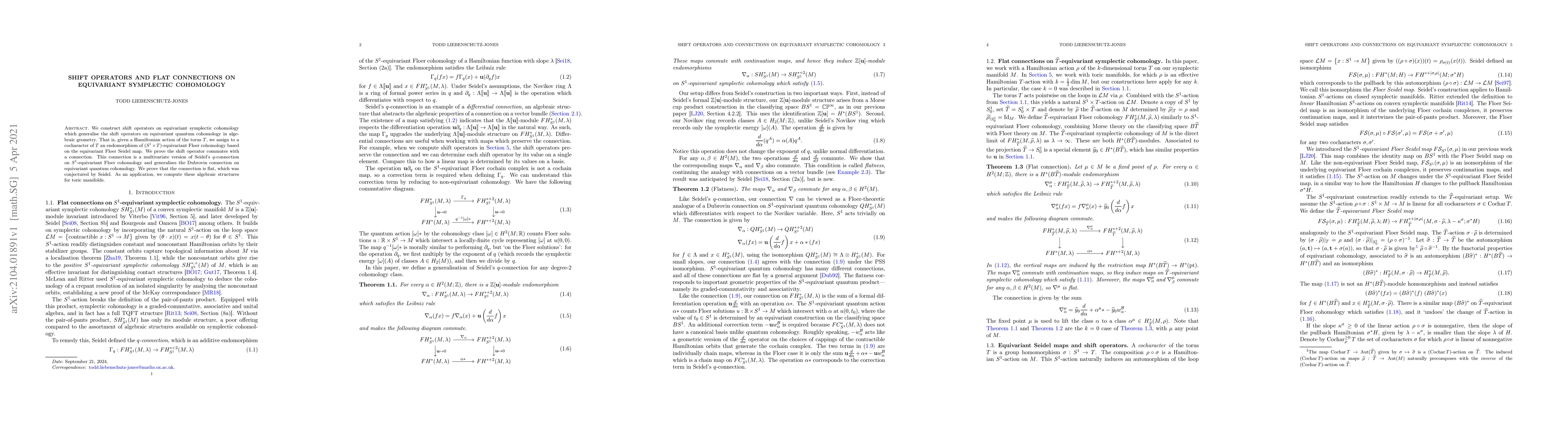 The paper constructs shift operators on equivariant symplectic cohomology that generalize those in equivariant quantum cohomology, proving the shift operator commutes with a newly defined multivariate connection. This connection generalizes Seidel's $q$-connection and the Dubrovin connection, and the authors prove its flatness. The structures are applied to compute these for toric manifolds.