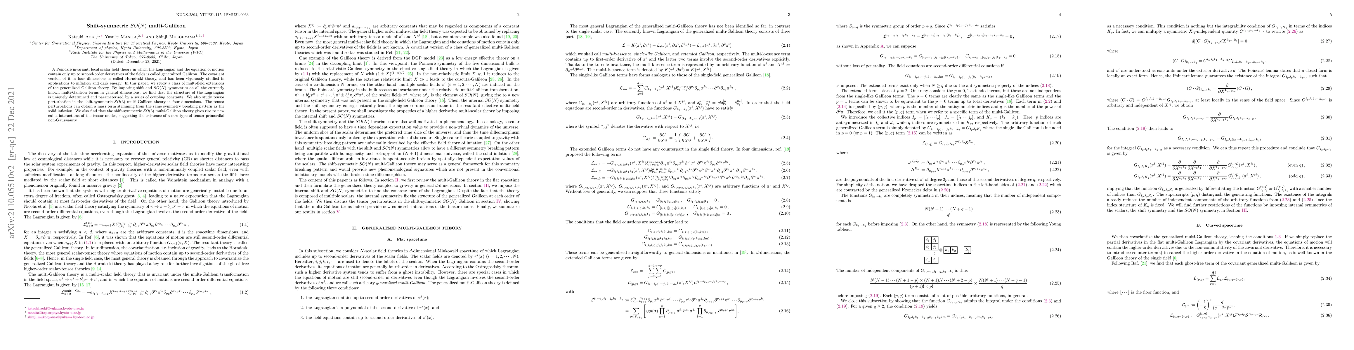 This paper explores shift-symmetric $SO(N)$ multi-Galileon theories, determining their unique Lagrangian structure through imposed symmetries. It also investigates tensor perturbations in four-dimensional $SO(3)$ multi-Galileon, revealing mass terms and new cubic interactions, indicating potential tensor primordial non-Gaussianity.