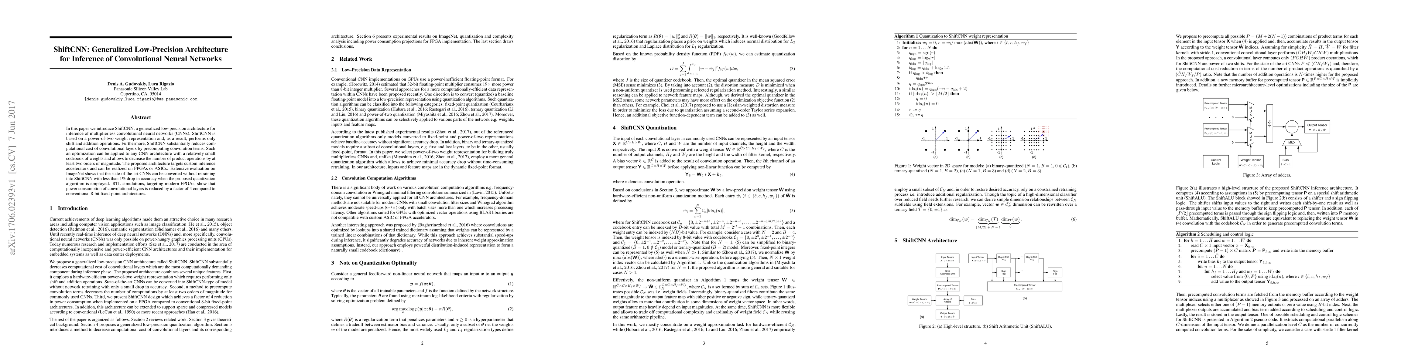 ShiftCNN is a low-precision architecture for efficient inference in CNNs, utilizing shift and addition operations instead of multipliers. It achieves significant reductions in computational cost and power consumption, maintaining accuracy close to conventional methods.