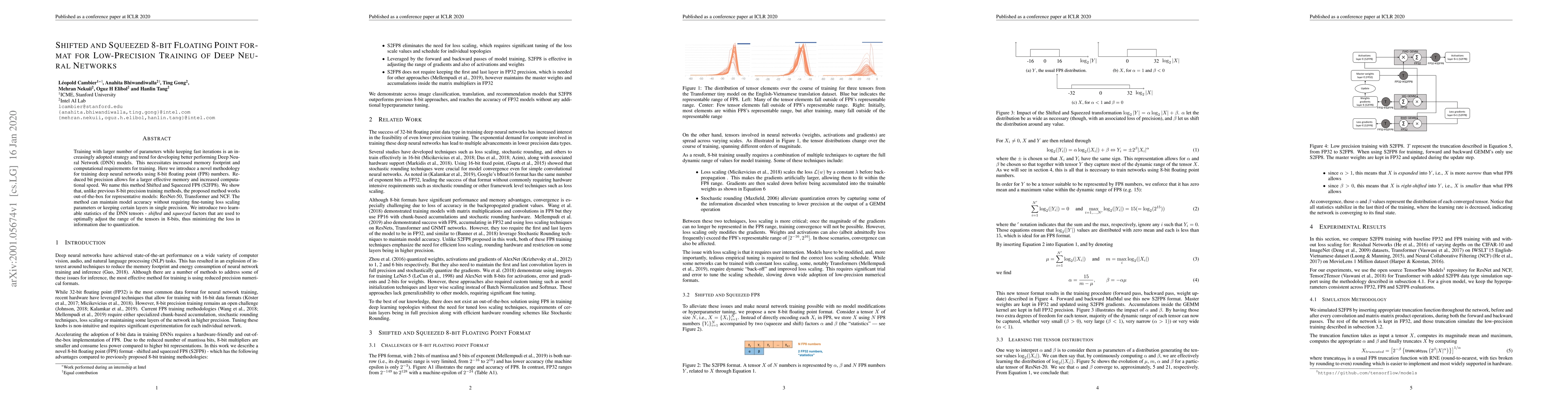 This paper introduces Shifted and Squeezed FP8 (S2FP8), a novel 8-bit floating point training method for deep neural networks that maintains accuracy without fine-tuning. It uses learnable shifted and squeezed factors to adjust tensor ranges, enabling efficient training with large models like ResNet-50, Transformer, and NCF.