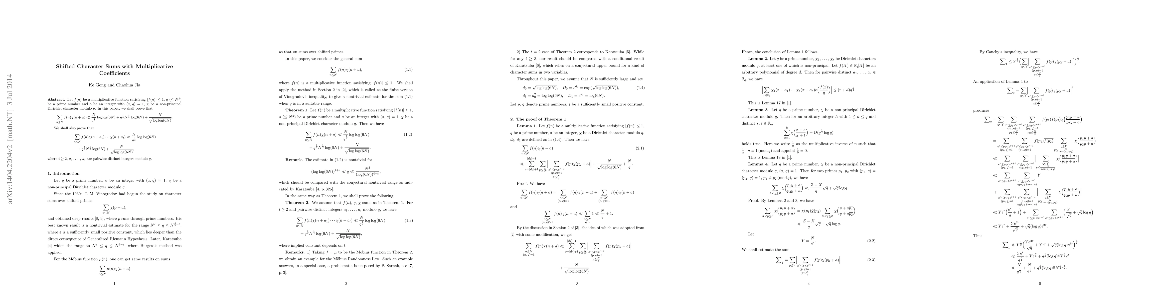 Let $f(n)$ be a multiplicative function satisfying $|f(n)|\leq 1$, $q$ $(\leq N^2)$ be a prime number and $a$ be an integer with $(a,\,q)=1$, $\chi$ be a non-principal Dirichlet character modulo $q$. In this paper, we shall prove that $$ \sum_{n\leq N}f(n)\chi(n+a)\ll {N\over q^{1\over 4}}\log\log(6N)+q^{1\over 4}N^{1\over 2}\log(6N)+{N\over \sqrt{\log\log(6N)}}. $$ We shall also prove that \begin{align*} &\sum_{n\leq N}f(n)\chi(n+a_1)\cdots\chi(n+a_t)\ll {N\over q^{1\over 4}}\log\log(6N)\\ &\quad+q^{1\over 4}N^{1\over 2}\log(6N)+{N\over \sqrt{\log\log(6N)}}, \end{align*} where $t\geq 2$, $a_1,\,\cdots,\,a_t$ are pairwise distinct integers modulo $q$.