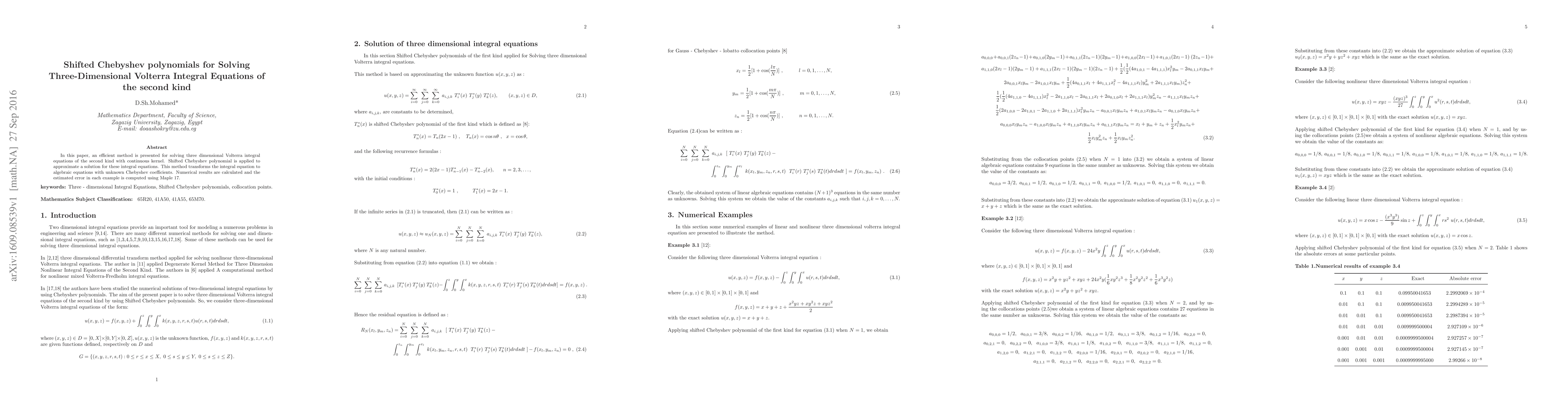 This paper proposes an efficient method for solving three-dimensional Volterra integral equations of the second kind using shifted Chebyshev polynomials, transforming the integral equation into algebraic equations. Numerical results and error estimates are computed using Maple 17.