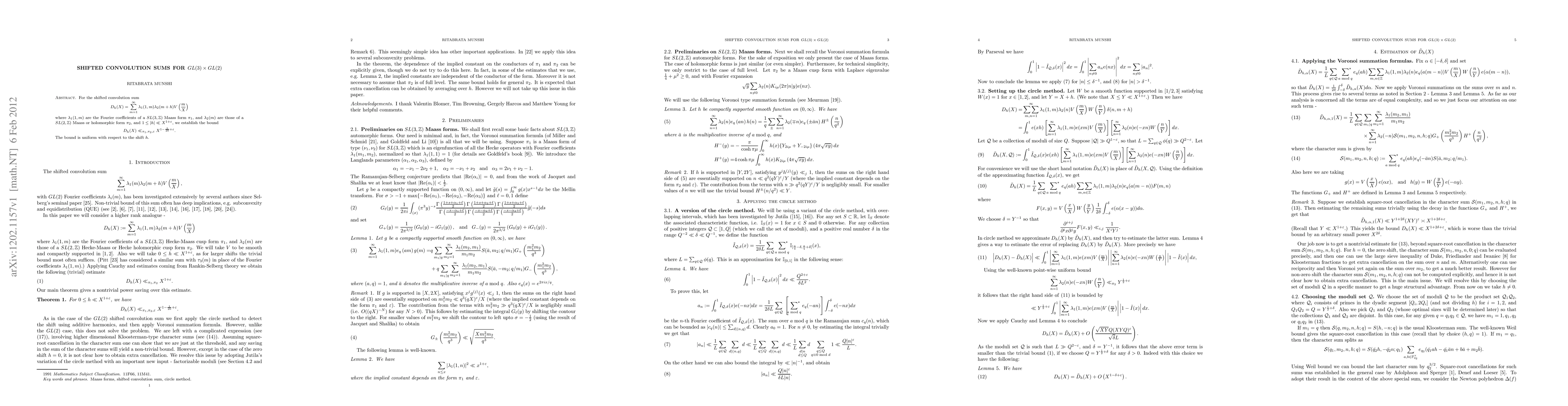 This research paper establishes a bound for the shifted convolution sum $D_h(X)$ over $GL(3) imes GL(2)$, showing that it grows at most like $X^{1-(1/20)+ ho}$. The bound is uniform with respect to the shift $h$ and has implications for understanding the growth of similar sums in related areas.
