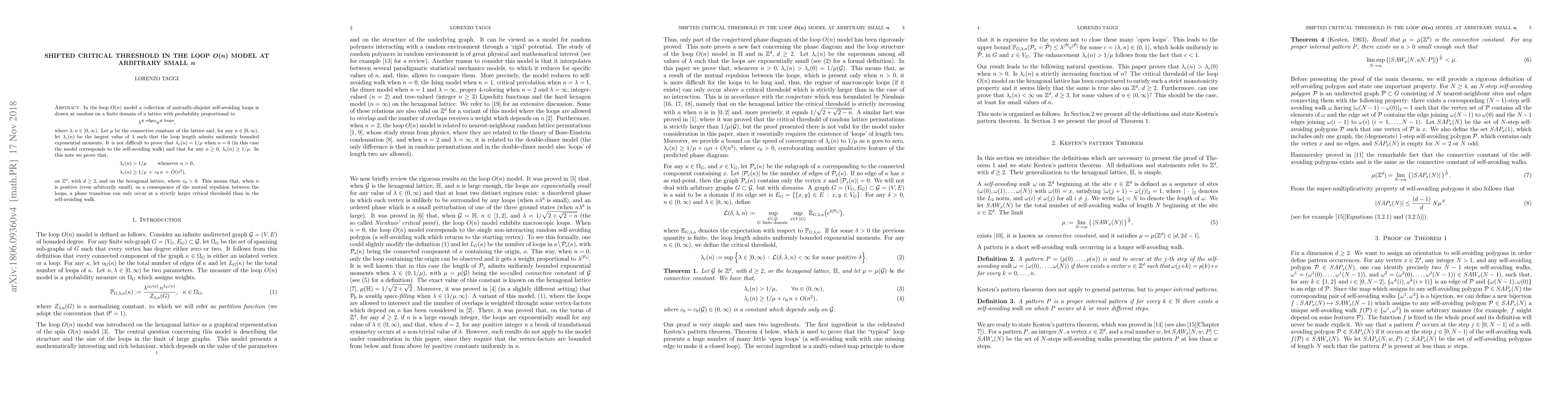 In the loop $O(n)$ model a collection of mutually-disjoint self-avoiding loops is drawn at random on a finite domain of a lattice with probability proportional to $${\lambda^{\# \mbox{edges}} n^{\# \mbox{loops}},}$$ where $\lambda, n \in [0, \infty)$. Let $\mu$ be the connective constant of the lattice and, for any $n \in [0, \infty)$, let $\lambda_c(n)$ be the largest value of $\lambda$ such that the loop length admits uniformly bounded exponential moments. It is not difficult to prove that $\lambda_c(n) =1/\mu$ when $n=0$ (in this case the model corresponds to the self-avoiding walk) and that for any $n \geq 0$, $\lambda_c(n) \geq 1/\mu$. In this note we prove that, \begin{align*} \lambda_c(n) & > 1/\mu \, \, \, \, \, \, \, \, \, \, \, \mbox{whenever $n >0$}, \\ \lambda_c(n) & \geq 1/\mu \, + \, c_0 \, n \, + \, O(n^2), \end{align*} on $\mathbb{Z}^d$, with $d \geq 2$, and on the hexagonal lattice, where $c_0>0$. This means that, when $n$ is positive (even arbitrarily small), as a consequence of the mutual repulsion between the loops, a phase transition can only occur at a strictly larger critical threshold than in the self-avoiding walk.