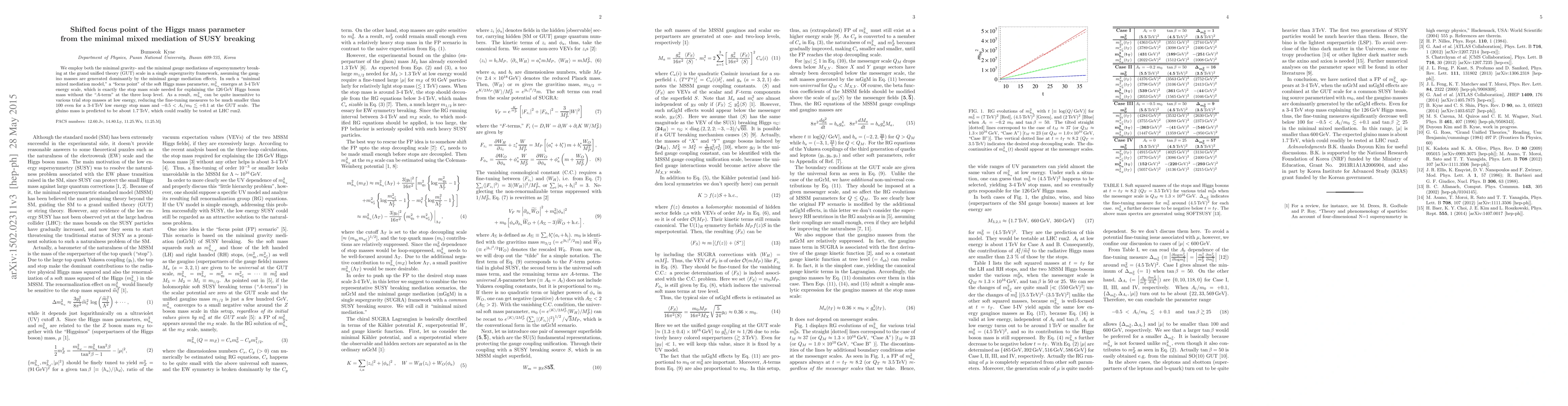 We employ both the minimal gravity- and the minimal gauge mediations of supersymmetry breaking at the grand unified theory (GUT) scale in a single supergravity framework, assuming the gaugino masses are generated dominantly by the minimal gauge mediation effects. In such a "minimal mixed mediation model," a "focus point" of the soft Higgs mass parameter, m_{h_u}^2 emerges at 3-4 TeV energy scale, which is exactly the stop mass scale needed for explaining the 126 GeV Higgs boson mass without the "A-term" at the three loop level. As a result, m_{h_u}^2 can be quite insensitive to various trial stop masses at low energy, reducing the fine-tuning measures to be much smaller than 100 even for a 3-4 TeV low energy stop mass and -0.5 < A_t/m_0 < +0.1 at the GUT scale. The gluino mass is predicted to be about 1.7 TeV, which could readily be tested at LHC run2.
