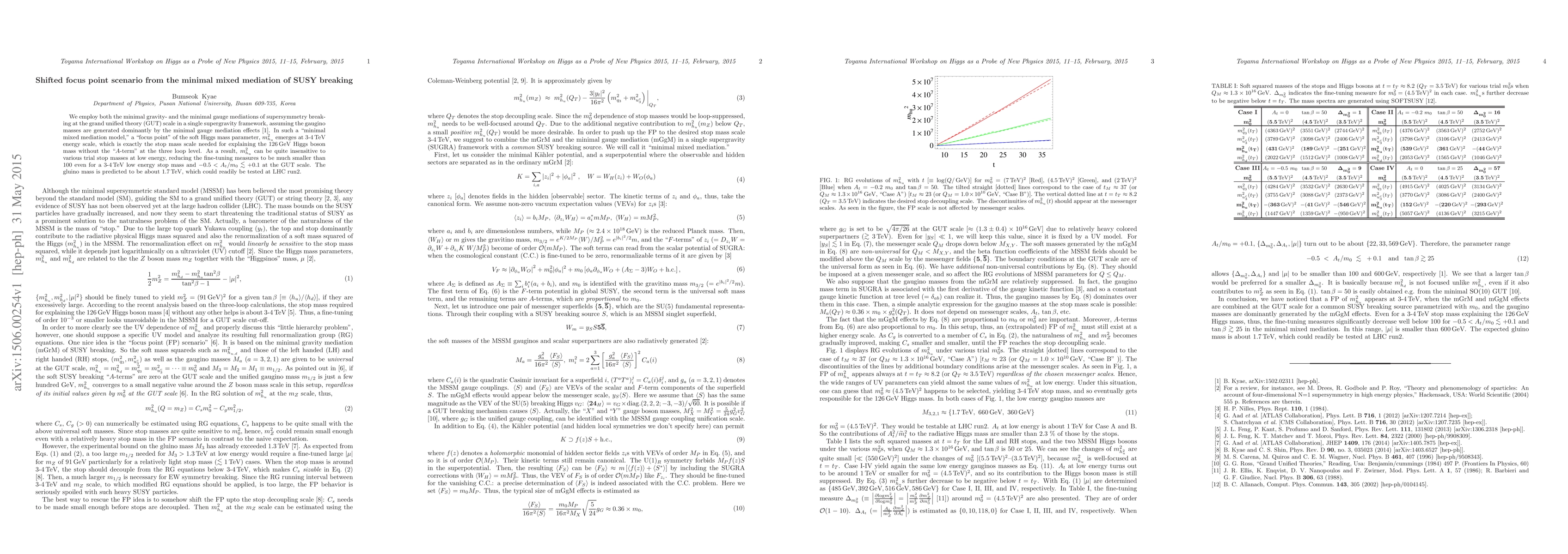 We employ both the minimal gravity- and the minimal gauge mediations of supersymmetry breaking at the grand unified theory (GUT) scale in a single supergravity framework, assuming the gaugino masses are generated dominantly by the minimal gauge mediation effects. In such a "minimal mixed mediation model," a "focus point" of the soft Higgs mass parameter, m_{h_u}^2 emerges at 3-4 TeV energy scale, which is exactly the stop mass scale needed for explaining the 126 GeV Higgs boson mass without the "A-term" at the three loop level. As a result, m_{h_u}^2 in the MSSM can be quite insensitive to various trial stop masses at low energy, reducing the fine-tuning measures to be much smaller than 100 even for a 3-4 TeV low energy stop mass and -0.5 < A_t / m_0 < +0.1 at the GUT scale. The $\mu$ parameter is smaller than 600 GeV. The gluino mass is predicted to be about 1.7 TeV, which could readily be tested at LHC run2.