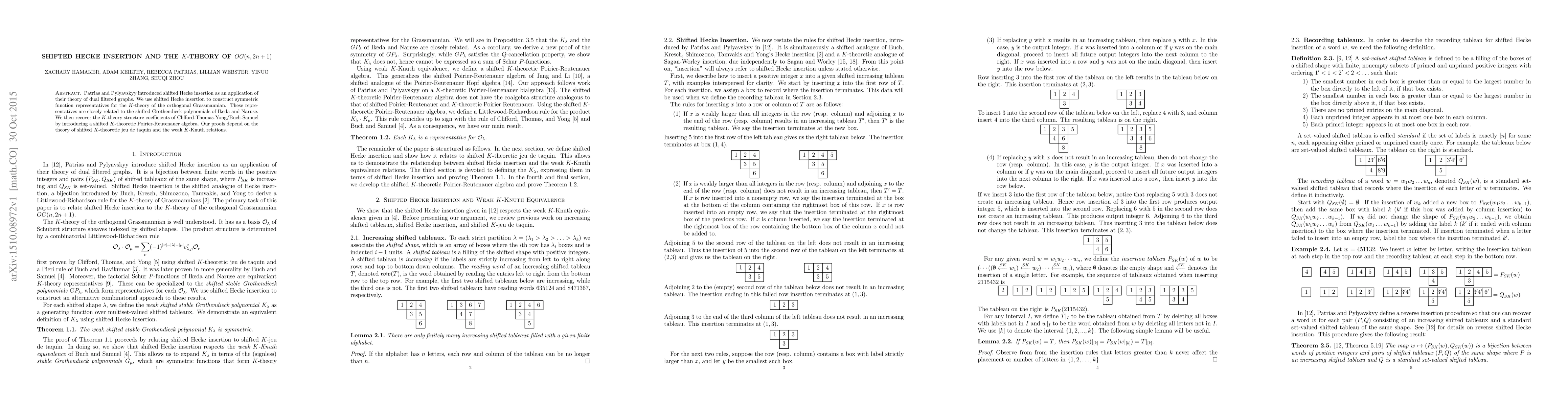 Patrias and Pylyavskyy introduced shifted Hecke insertion as an application of their theory of dual filtered graphs. We use shifted Hecke insertion to construct symmetric function representatives for the K-theory of the orthogonal Grassmannian. These representatives are closely related to the shifted Grothendieck polynomials of Ikeda and Naruse. We then recover the K-theory structure coefficients of Clifford-Thomas-Yong/Buch-Samuel by introducing a shifted K-theoretic Poirier-Reutenauer algebra. Our proofs depend on the theory of shifted K-theoretic jeu de taquin and the weak K-Knuth relations.