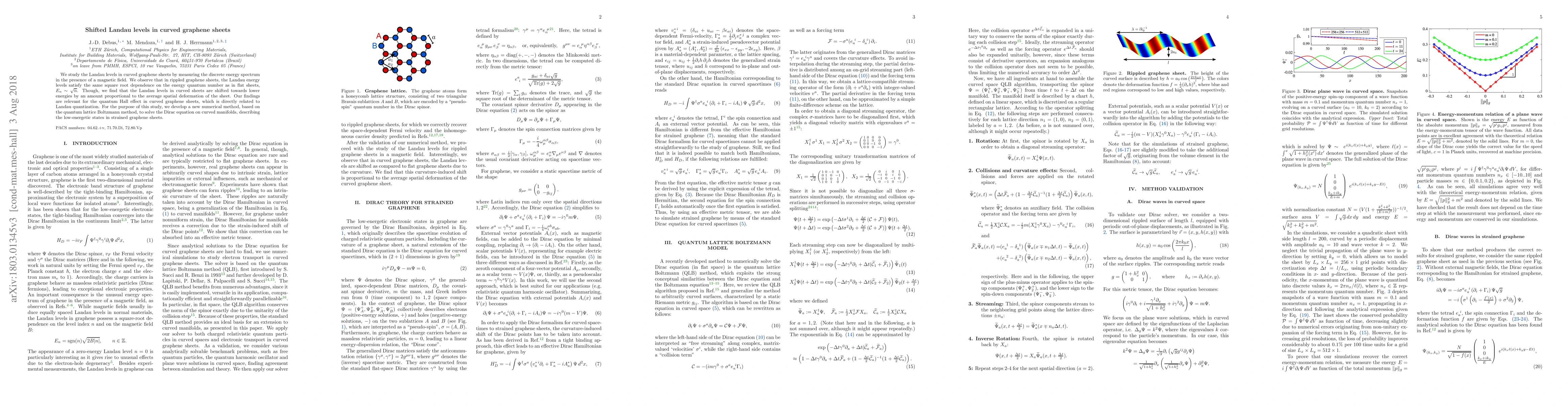 This paper investigates how curvature affects Landau levels in graphene sheets under a magnetic field, finding that while the energy spectrum's square root dependence remains, the levels are shifted lower proportionally to the sheet's average deformation. A new numerical method based on the quantum lattice Boltzmann method is developed to study these effects.
