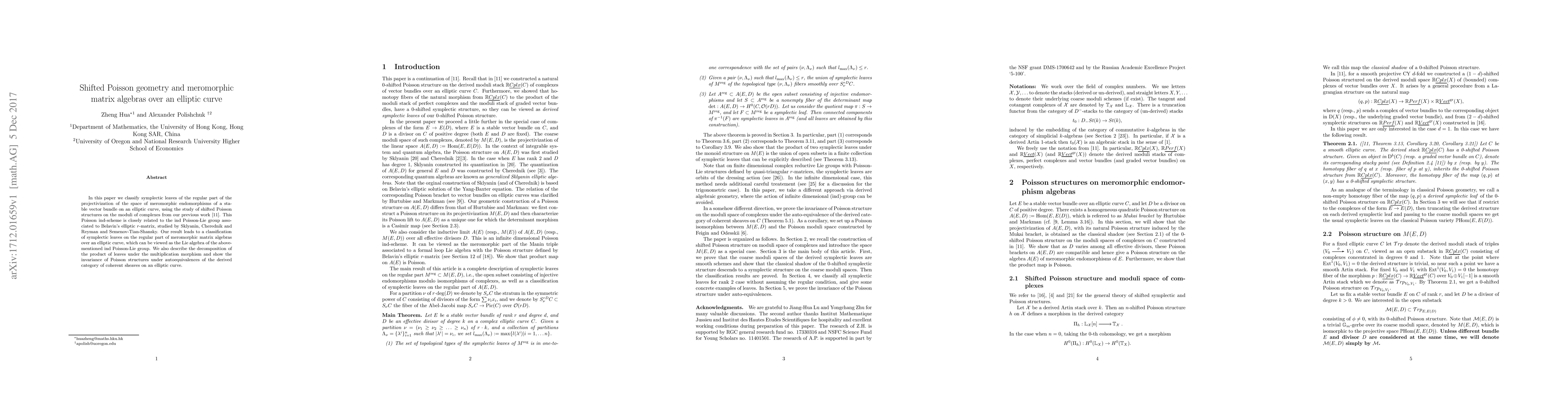 This paper classifies symplectic leaves of meromorphic matrix algebras over an elliptic curve, utilizing shifted Poisson geometry and structures from previous work on moduli of complexes. The result reveals the invariance of Poisson structures under autoequivalences of coherent sheaves and decomposes the product of these leaves under multiplication.