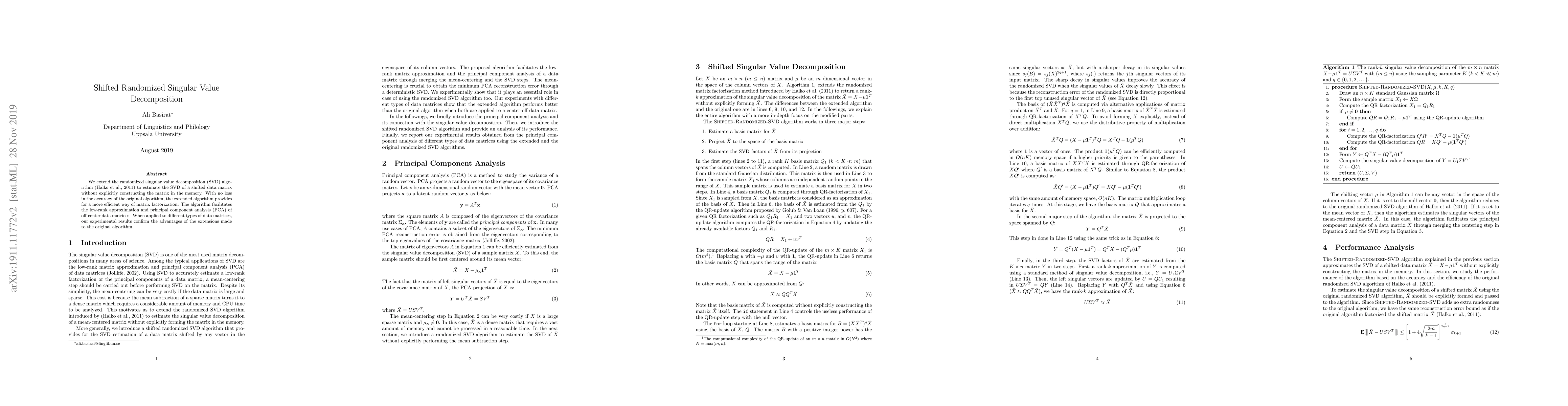 This paper extends the randomized SVD algorithm to efficiently estimate the SVD of shifted data matrices without constructing the full matrix, improving efficiency for low-rank approximation and PCA. Experimental results demonstrate the algorithm's advantages over the original method.