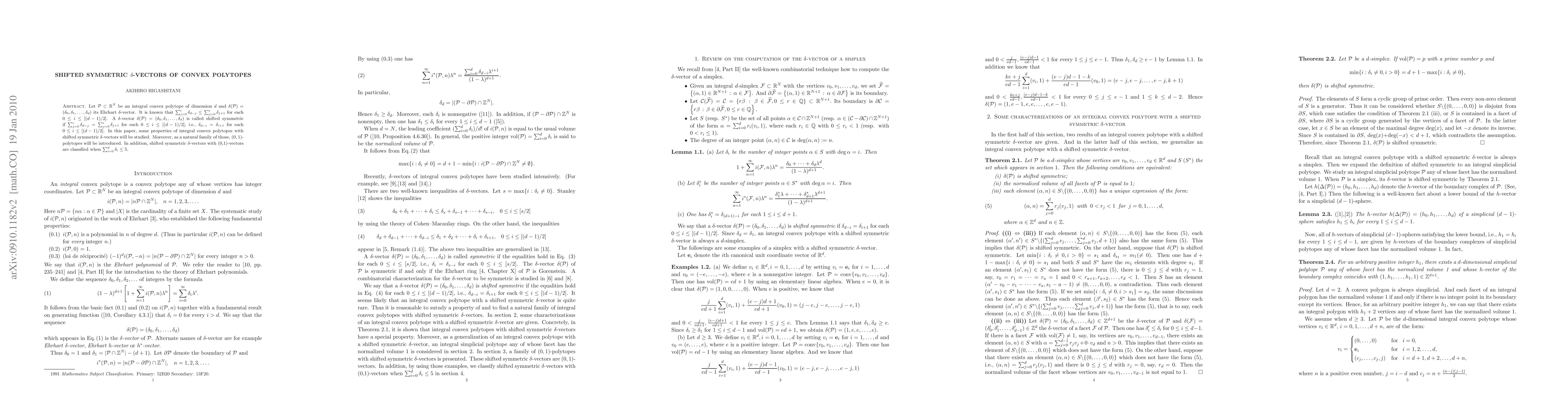 A $\delta$-vector $\delta(\Pc)= (\delta_0, \delta_1, ..., \delta_d)$ is called shifted symmetric if $\delta_{d-i} = \delta_{i+1}$ for each $0 \leq i \leq [(d-1)/2]$. A natural family of $(0,1)$-polytopes with shifted symmetric $\delta$-vectors will be studied.