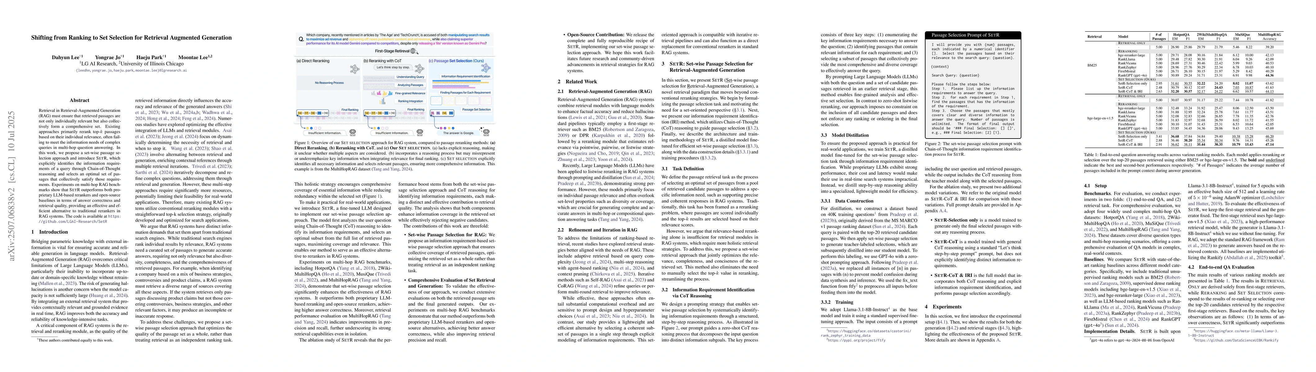 Retrieval in Retrieval-Augmented Generation(RAG) must ensure that retrieved passages are not only individually relevant but also collectively form a comprehensive set. Existing approaches primarily rerank top-k passages based on their individual relevance, often failing to meet the information needs of complex queries in multi-hop question answering. In this work, we propose a set-wise passage selection approach and introduce SETR, which explicitly identifies the information requirements of a query through Chain-of-Thought reasoning and selects an optimal set of passages that collectively satisfy those requirements. Experiments on multi-hop RAG benchmarks show that SETR outperforms both proprietary LLM-based rerankers and open-source baselines in terms of answer correctness and retrieval quality, providing an effective and efficient alternative to traditional rerankers in RAG systems. The code is available at https://github.com/LGAI-Research/SetR
