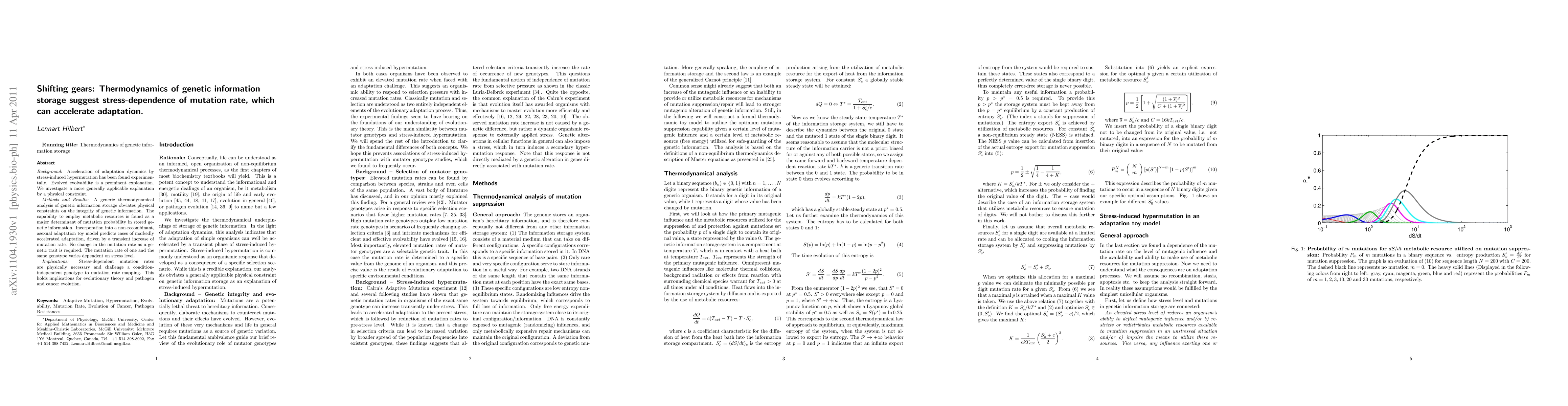 Background: Acceleration of adaptation dynamics by stress-induced hypermutation has been found experimentally. Evolved evolvability is a prominent explanation. We investigate a more generally applicable explanation by a physical constraint. Methods and Results: A generic thermodynamical analysis of genetic information storage obviates physical constraints on the integrity of genetic information. The capability to employ metabolic resources is found as a major determinant of mutation probability in stored genetic information. Incorporation into a non-recombinant, asexual adaptation toy model predicts cases of markedly accelerated adaptation, driven by a transient increase of mutation rate. No change in the mutation rate as a genetic trait is required. The mutation rate of one and the same genotype varies dependent on stress level. Implications: Stress-dependent mutation rates are physically necessary and challenge a condition-independent genotype to mutation rate mapping. This holds implications for evolutionary theory and pathogen and cancer evolution.