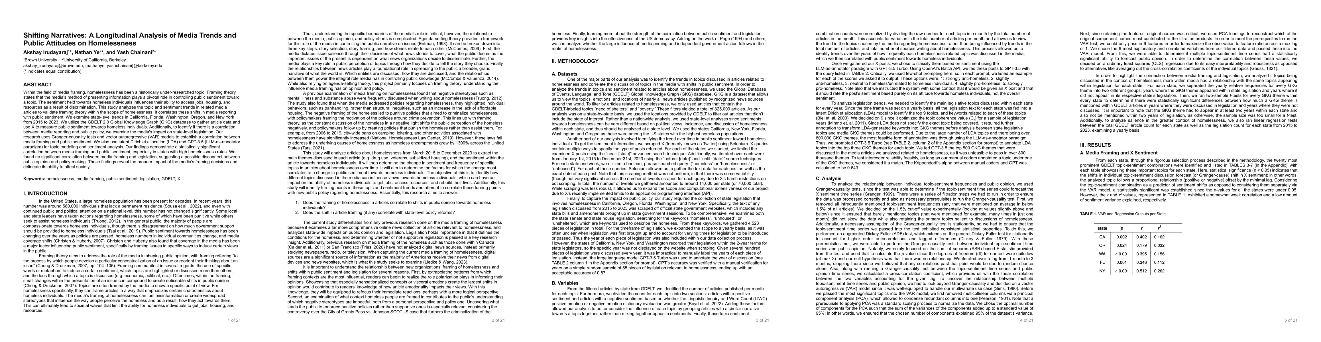 Within the field of media framing, homelessness has been a historically under-researched topic. Framing theory states that the media's method of presenting information plays a pivotal role in controlling public sentiment toward a topic. The sentiment held towards homeless individuals influences their ability to access jobs, housing, and resources as a result of discrimination. This study analyzes the topic and sentiment trends in related media articles to validate framing theory within the scope of homelessness. It correlates these shifts in media reporting with public sentiment. We examine state-level trends in California, Florida, Washington, Oregon, and New York from 2015 to 2023. We utilize the GDELT 2.0 Global Knowledge Graph (GKG) database to gather article data and use X to measure public sentiment towards homeless individuals. Additionally, to identify if there is a correlation between media reporting and public policy, we examine the media's impact on state-level legislation. Our research uses Granger-causality tests and vector autoregressive (VAR) models to establish a correlation between media framing and public sentiment. We also use latent Dirichlet allocation (LDA) and GPT-3.5 (LLM-as-annotator paradigm) for topic modeling and sentiment analysis. Our findings demonstrate a statistically significant correlation between media framing and public sentiment, especially in states with high homelessness rates. We found no significant correlation between media framing and legislation, suggesting a possible disconnect between public opinion and policy-making. These findings reveal the broader impact of the media's framing decisions and delineate its ability to affect society.