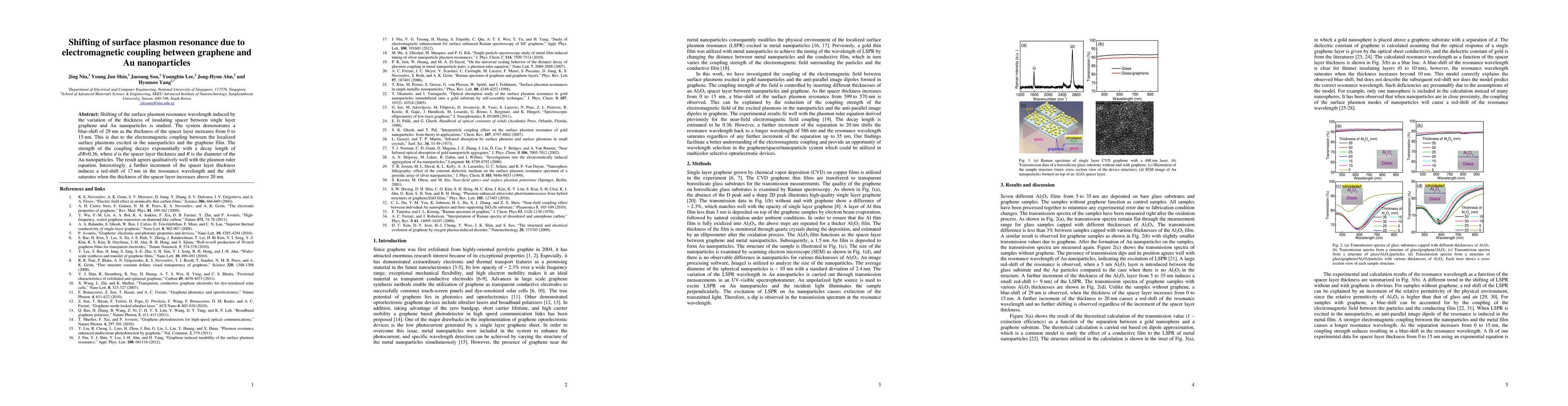This study investigates how the surface plasmon resonance wavelength shifts due to electromagnetic coupling between graphene and Au nanoparticles, showing a blue shift of 29 nm as the spacer thickness increases to 15 nm. The coupling strength decays exponentially with a decay length of d/R=0.36, and a red shift occurs beyond 20 nm.