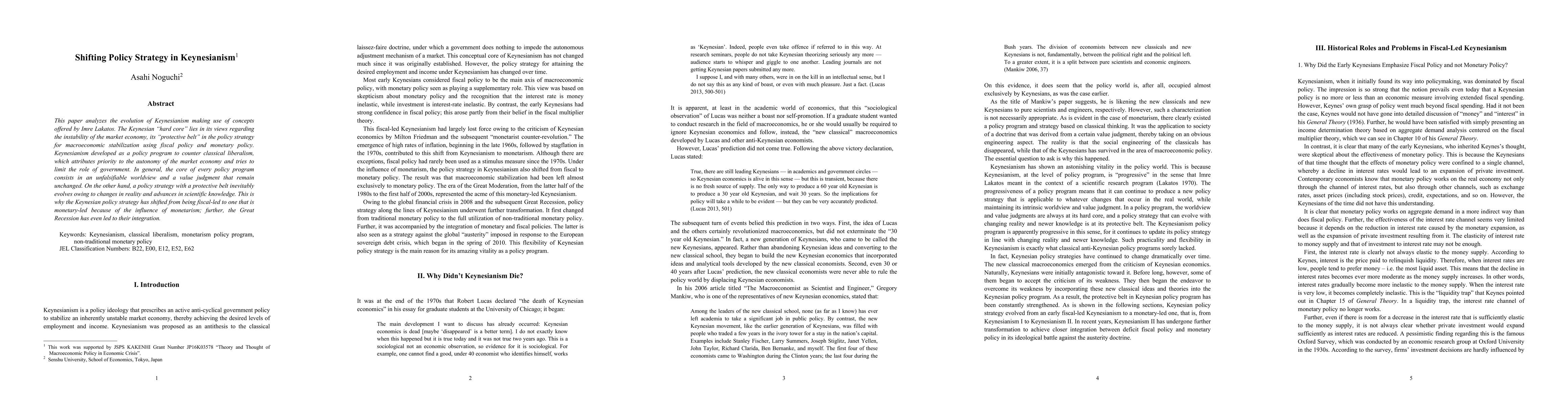 This paper analyzes the evolution of Keynesianism making use of concepts offered by Imre Lakatos. The Keynesian "hard core" lies in its views regarding the instability of the market economy, its "protective belt" in the policy strategy for macroeconomic stabilization using fiscal policy and monetary policy. Keynesianism developed as a policy program to counter classical liberalism, which attributes priority to the autonomy of the market economy and tries to limit the role of government. In general, the core of every policy program consists in an unfalsifiable worldview and a value judgment that remain unchanged. On the other hand, a policy strategy with a protective belt inevitably evolves owing to changes in reality and advances in scientific knowledge. This is why the Keynesian policy strategy has shifted from being fiscal-led to one that is monetary-led because of the influence of monetarism; further, the Great Recession has even led to their integration.