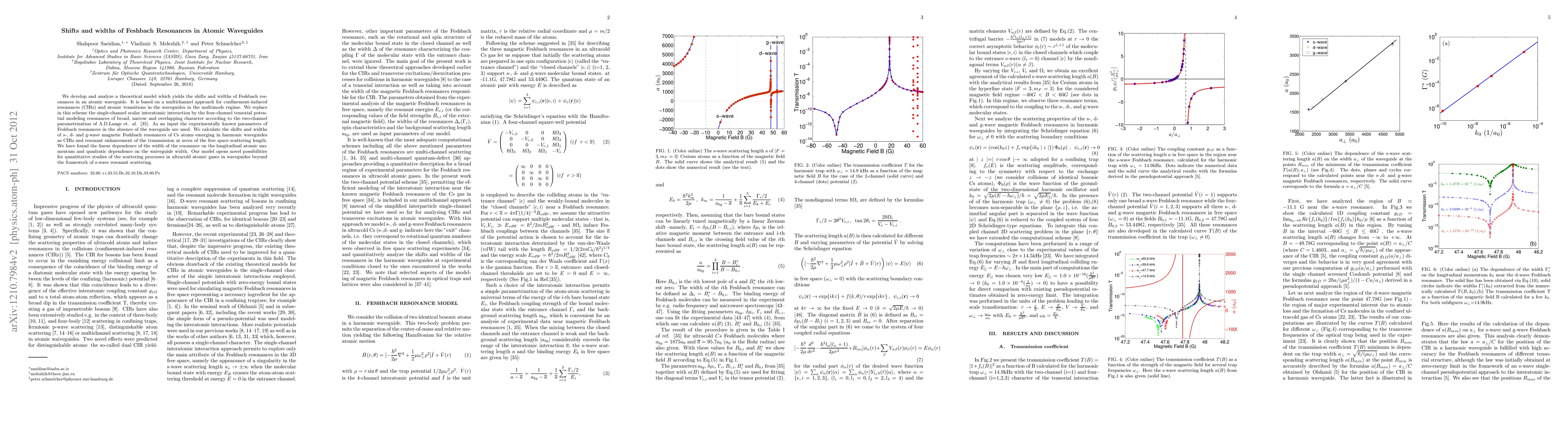 This paper develops a theoretical model to calculate shifts and widths of Feshbach resonances in atomic waveguides, using a four-channel tensorial potential approach. It finds linear dependence of resonance width on atomic momentum and quadratic dependence on waveguide width, offering new insights into scattering processes in ultracold atomic gases.