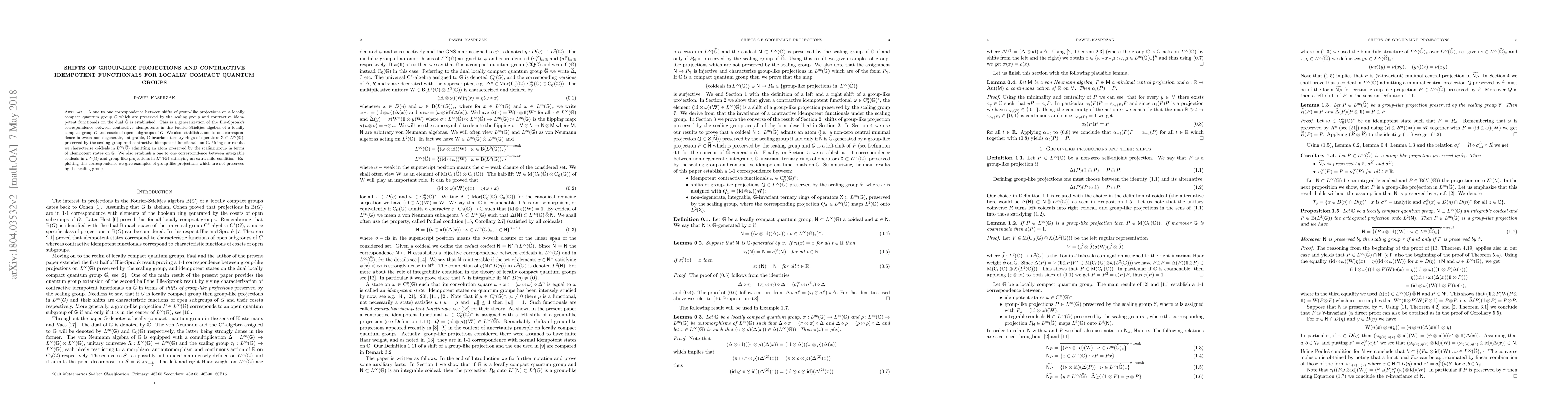 The paper establishes a one-to-one correspondence between shifts of group-like projections on locally compact quantum groups and contractive idempotent functionals on their duals, generalizing a known result for locally compact groups. It also characterizes coideals in operator algebras on quantum groups using this correspondence.