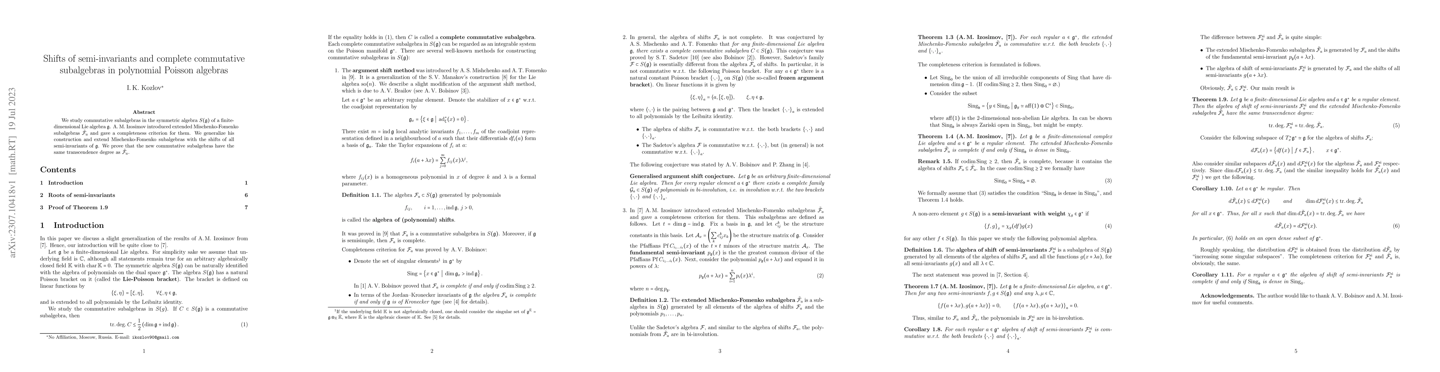 We study commutative subalgebras in the symmetric algebra $S(\mathfrak{g})$ of a finite-dimensional Lie algebra $\mathfrak{g}$. A. M. Izosimov introduced extended Mischenko-Fomenko subalgebras $\tilde{\mathcal{F}}_a$ and gave a completeness criterion for them. We generalize his construction and extend Mischenko-Fomenko subalgebras with the shifts of all semi-invariants of $\mathfrak{g}$. We prove that the new commutative subalgebras have the same transcendence degree as $\tilde{\mathcal{F}}_a$.