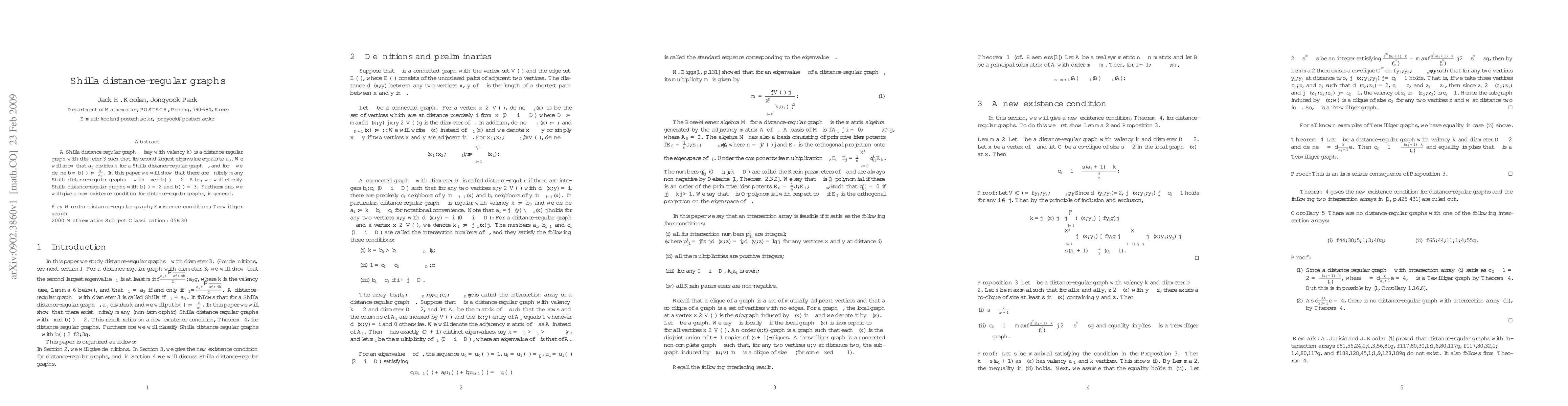 This paper studies Shilla distance-regular graphs, proving that their second largest eigenvalue divides their valency and identifying finitely many such graphs with fixed parameters. It classifies Shilla graphs with specific parameters and presents a new existence condition for distance-regular graphs.