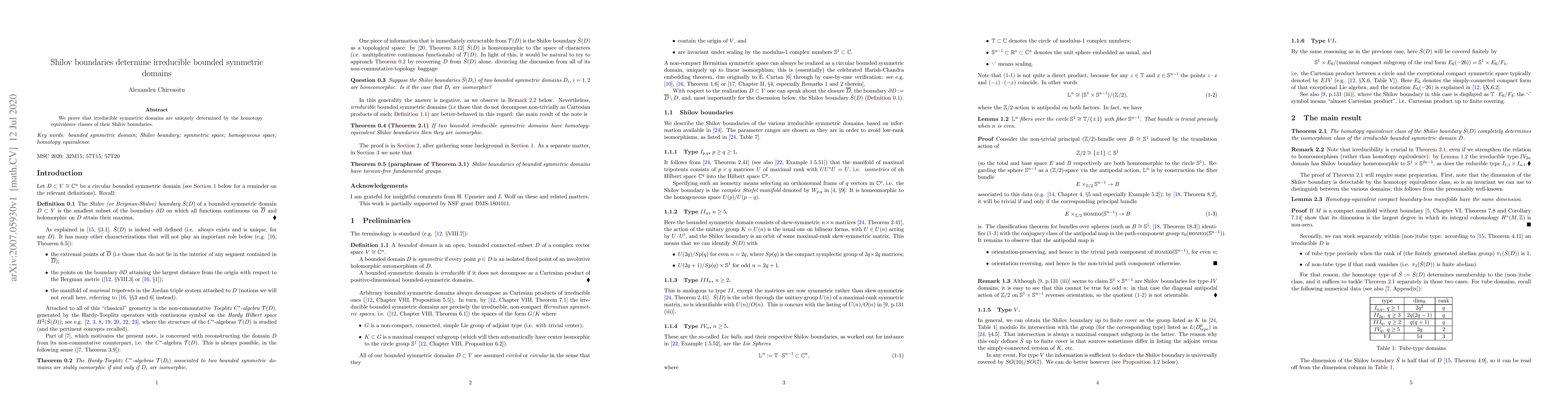 We prove that irreducible symmetric domains are uniquely determined by the homotopy equivalence classes of their Shilov boundaries.