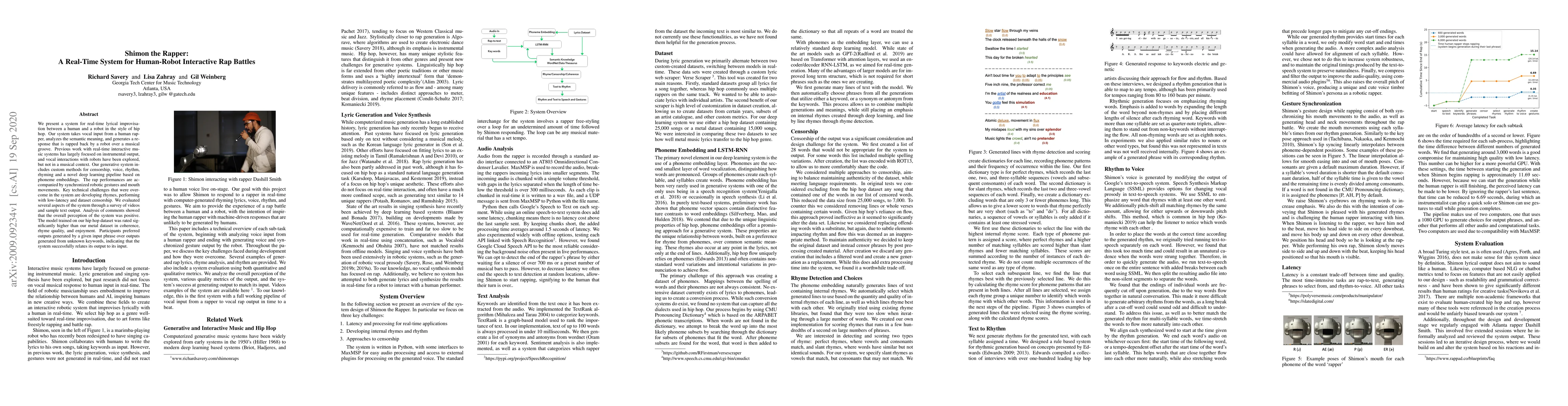 This paper introduces Shimon, a real-time system enabling human-robot rap battles. Shimon analyzes human vocal input for semantic meaning and generates rapped responses, incorporating censorship, voice, rhythm, and rhyming. It also synchronizes robotic gestures and mouth movements. The system overcame challenges in rhyme creation, low-latency performance, and dataset censorship. Evaluation through surveys and text analysis showed positive user perception, with hip hop dataset-trained models outperforming metal dataset models in coherence, rhyme quality, and enjoyment. Users preferred outputs based on known input phrases, indicating successful input-output relation.