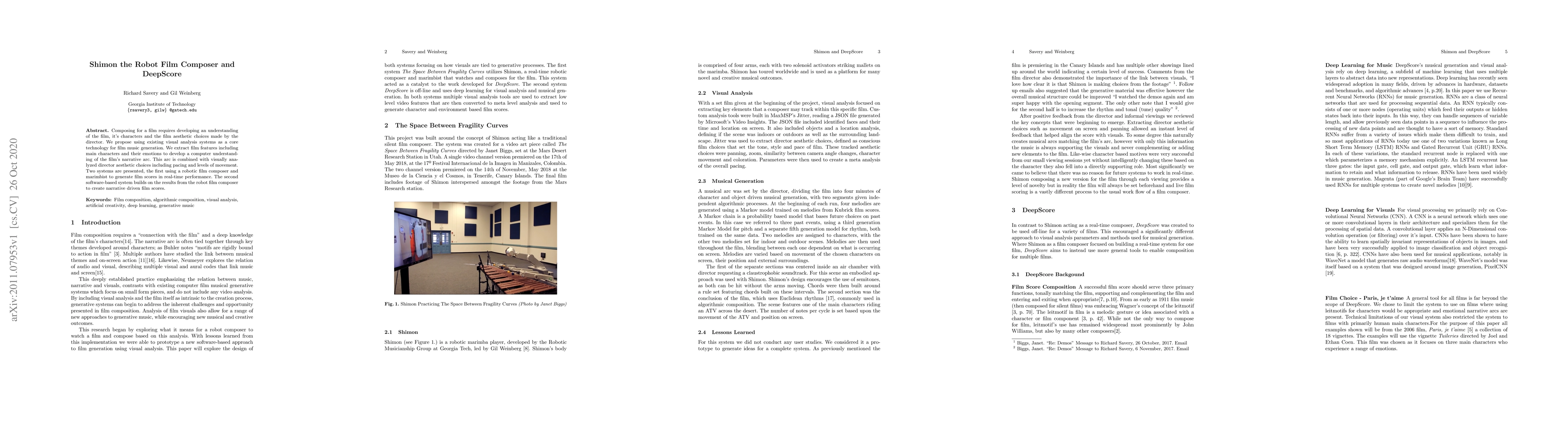 Composing for a film requires developing an understanding of the film, its characters and the film aesthetic choices made by the director. We propose using existing visual analysis systems as a core technology for film music generation. We extract film features including main characters and their emotions to develop a computer understanding of the film's narrative arc. This arc is combined with visually analyzed director aesthetic choices including pacing and levels of movement. Two systems are presented, the first using a robotic film composer and marimbist to generate film scores in real-time performance. The second software-based system builds on the results from the robot film composer to create narrative driven film scores.